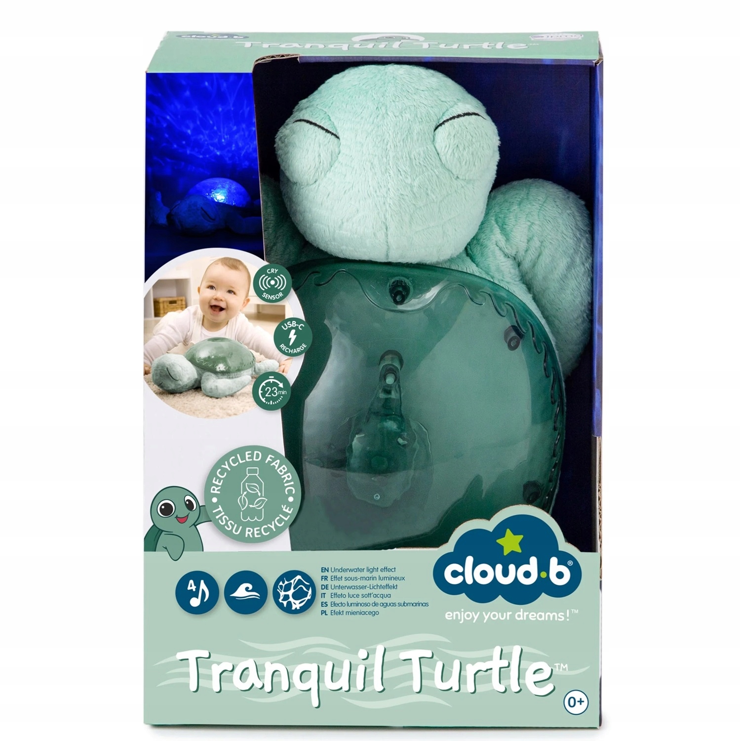 Мягкий, плюшевый, с прочным пластиковым корпусом. Лучше всего разместить черепаху на полу посередине комнаты и выключить свет, чтобы ощутить полный успокаивающий эффект океана на потолке и стенах. Просто нажмите кнопку на панцире черепахи, чтобы включить световой проектор и наслаждаться его свечением в течение целых 23 минут — этого достаточно, чтобы большинство детей спокойно заснули и отправились в страну грез. По истечении этого времени проектор автоматически выключается, тем самым продлевая срок службы батареи и позволяя ребенку погрузиться в самый глубокий сон.