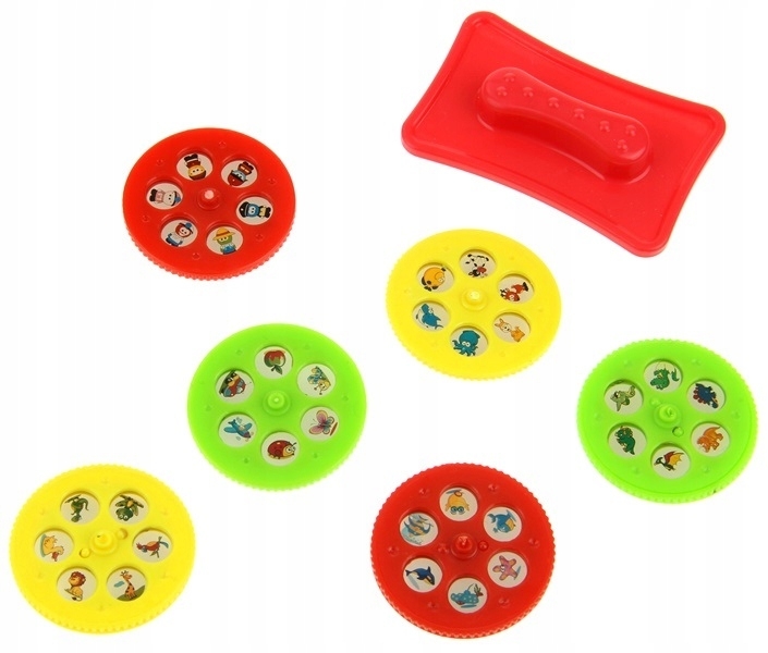 - 6 сменных дисков для проектора, каждый с 6 рисунками: вкл. наземные, водные и летающие животные и транспортные средства, фрукты, фигурки в профессиональной форме, насекомые, динозавры