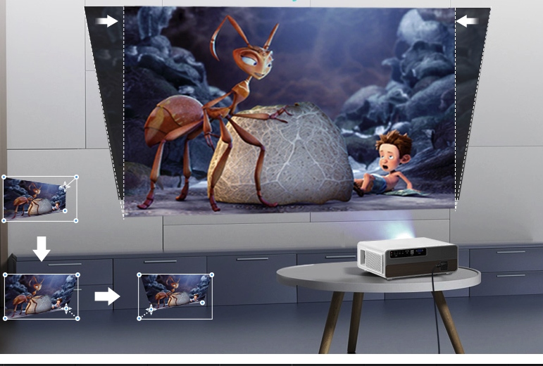 Кроме того, в настройках системы можно отрегулировать наклон изображения, благодаря чему можно настроить изображение так, чтобы проектор мог стоять даже под углом к стене, а изображение по-прежнему будет отображаться прямо на стене без лишних отклонений и искажений.