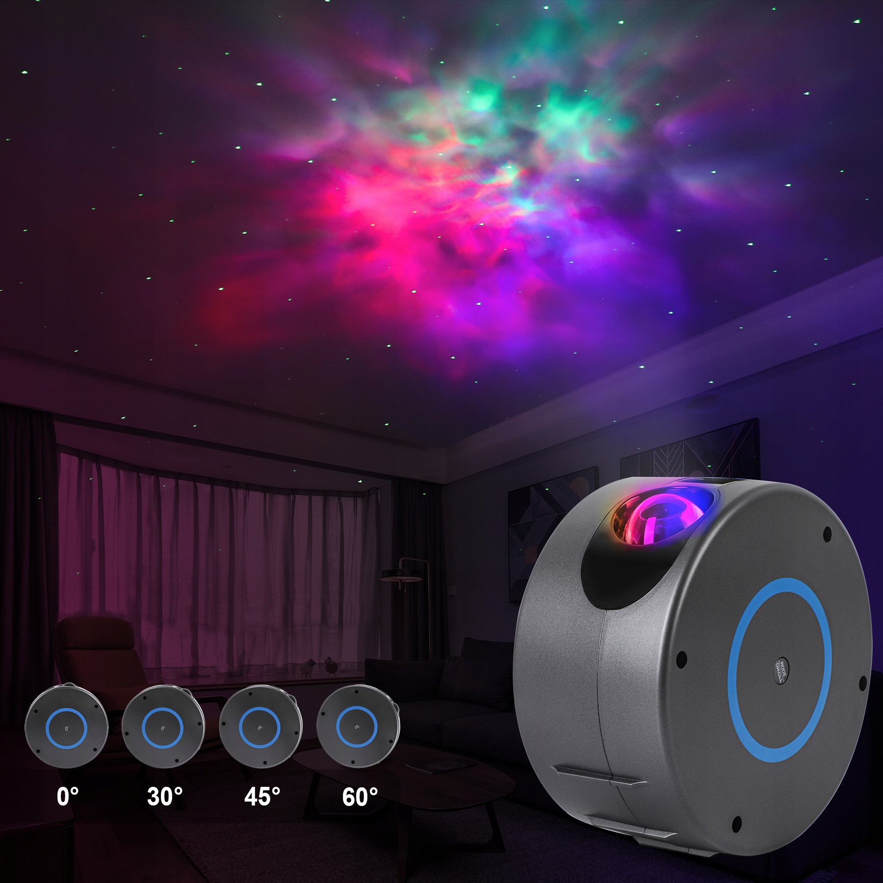 Этот звездный проектор Galaxy Light можно регулировать под 4 углами, а его основание имеет 4 стороны. Четыре разных угла проекции (30°/45°/60° на плоскости). Вы можете выбрать другое положение проекции, чтобы получить дополнительные визуальные впечатления.