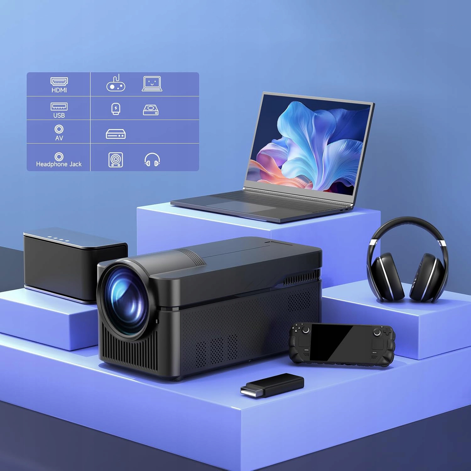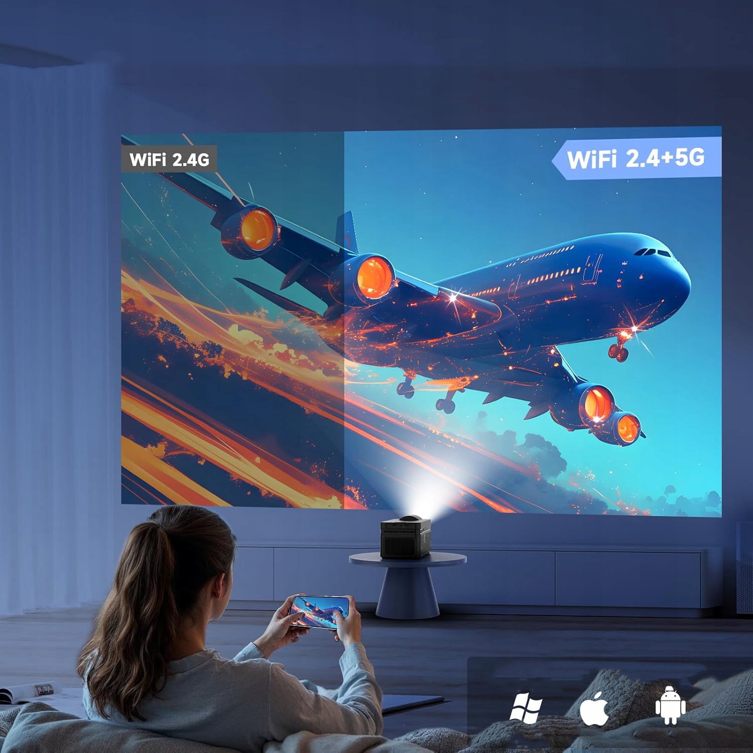 Двухдиапазонный Wi-Fi 2,4/5 ГГц и Bluetooth 5.2 обеспечивают стабильное подключение к сети и аудиоаксессуарам. Проектор также поддерживает беспроводную передачу изображений с телефонов, ноутбуков и других устройств, а порты HDMI и USB гарантируют универсальную совместимость.