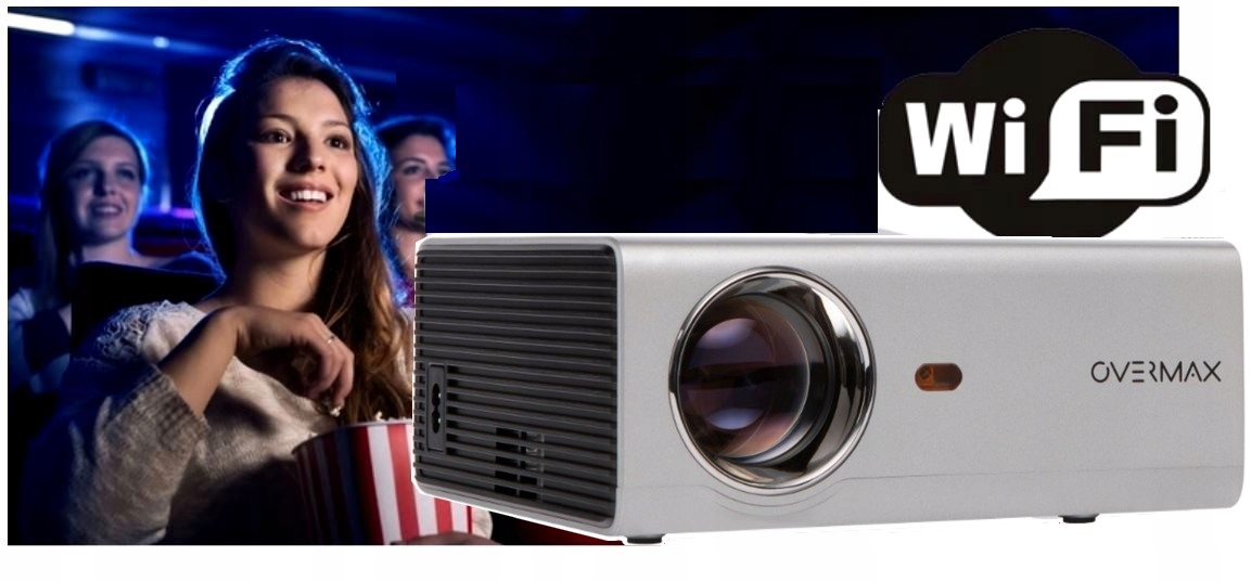 Новый проектор Overmax MULTIPIC 3.5 LED WiFi, серебристый, пульт дистанционного управления для беспроводной работы, 3 x RCA VIDEO мини-джек для кабеля RCA, сетевой кабель 230 В, Инструкция на польском языке, Коробка из серии OVERMAX MULTIPIC.