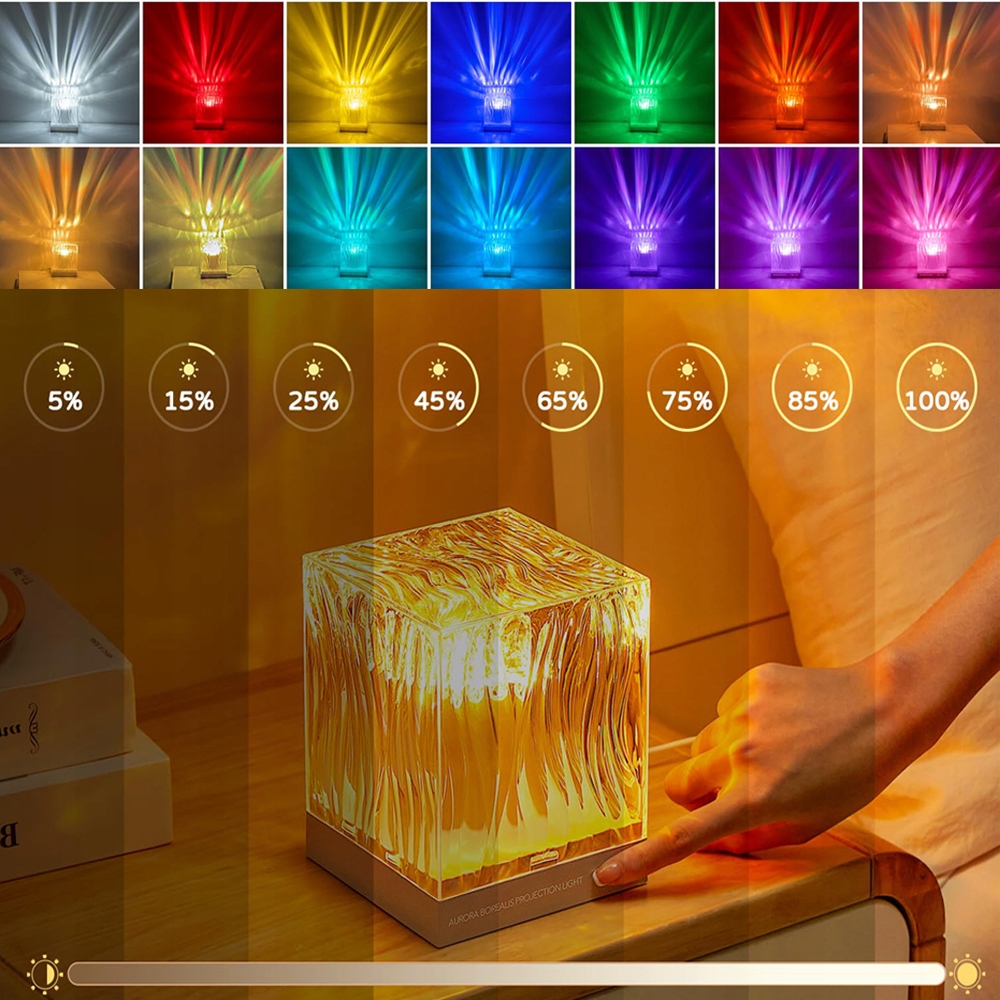 Проекционная лампа спальни предлагает 17 цветов RGB, которые можно легко выбрать с помощью дистанционного управления. Проекционная лампа с полярной аорурой имеет много световых эффектов. Благодаря уникальной квадратной конструкции с 5 поверхностями, излучающими свет и широкий спектр проекции, он освещает спальню до 360 °. Эта ночная проекционная лампа позволяет вам наслаждаться каждым мирным вечером.