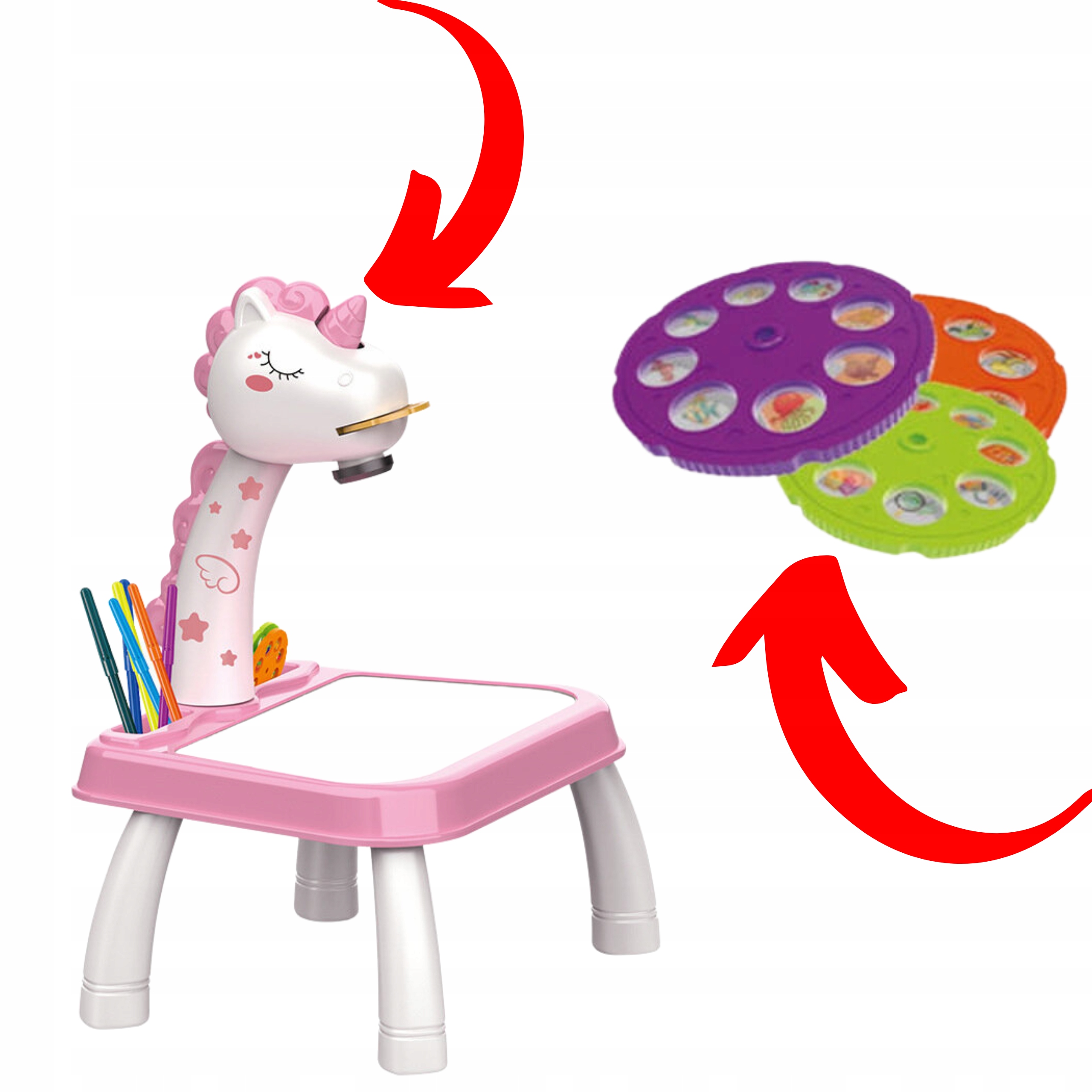 Каждый диск содержит 8 разных картинок (всего 24 картинки на выбор). Проектор отображает их на поверхности стола, что позволяет ребенку легко скопировать узор на лист бумаги или прямо на доску стола с помощью сухостирающихся маркеров. Регулируя резкость изображения, вы можете довести изображение до совершенства.