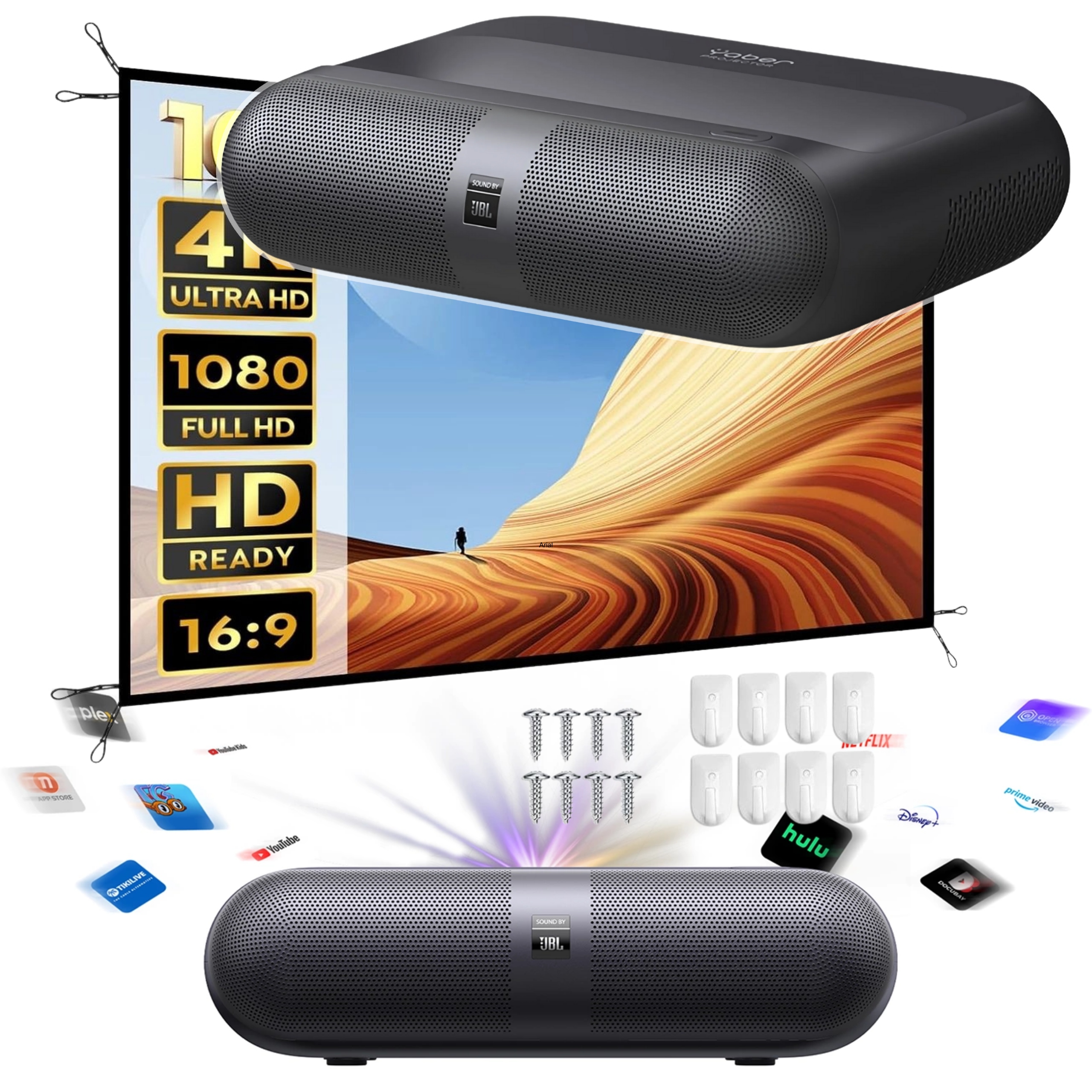 set: мультимедийный проектор yaber k300s laser rgb fullhd 1080p с динамиками JBL + Yaber YS-120F 120 "16: 9 Проекционный экран Портативный мобильный