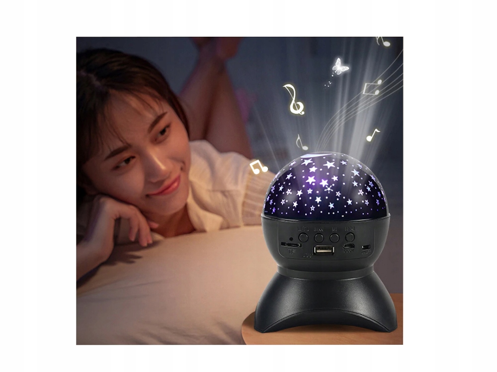 Проектор оснащен слотом для карты micro SD, USB, а также портами для зарядки постоянного тока 5 В и Bluetooth. Таким образом, мы можем воспроизводить музыку как с нашего флеш-накопителя, так и с нашего телефона. Динамик в этом маленьком устройстве очень громкий. Устройство идеально подходит для маленьких детей, которые смогут создать прекрасную атмосферу звездного неба перед сном, играя любимую колыбельную или сказку на ночь. p>