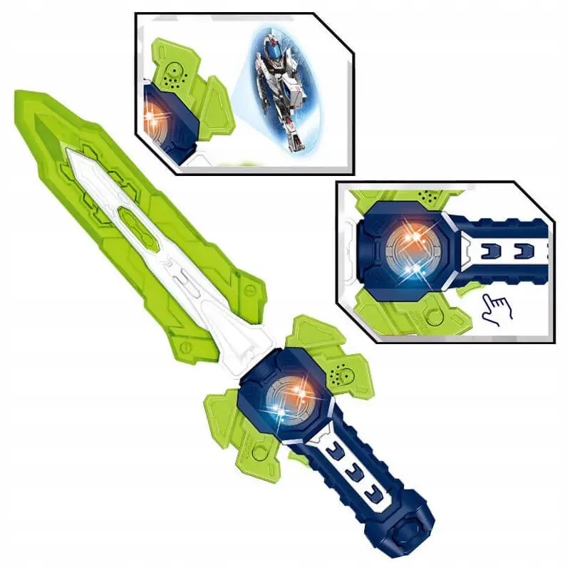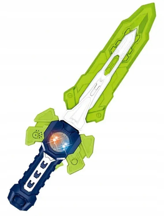 Меч имеет световые и звуковые эффекты. После нажатия кнопки на рукоятке меча лезвие загорается, создавая великолепный эффект и звук. Дополнительно в держателе имеется проектор, который после нажатия кнопки отображает изображение робота на стене. Меч имеет впечатляющие световые эффекты, что, несомненно, сделает игру очень увлекательной.