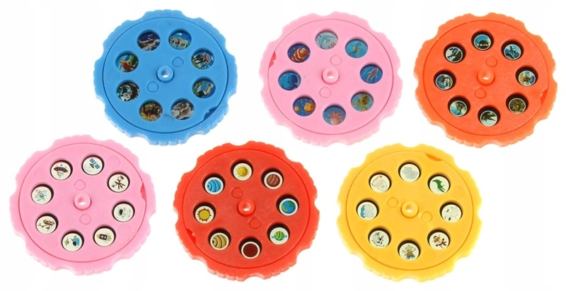 В комплект входят 6 сменных дисков. Каждый диск содержит 8 тематических фотографий с изображением: планет, животных сафари, водных животных, динозавров и космических аппаратов и объектов.