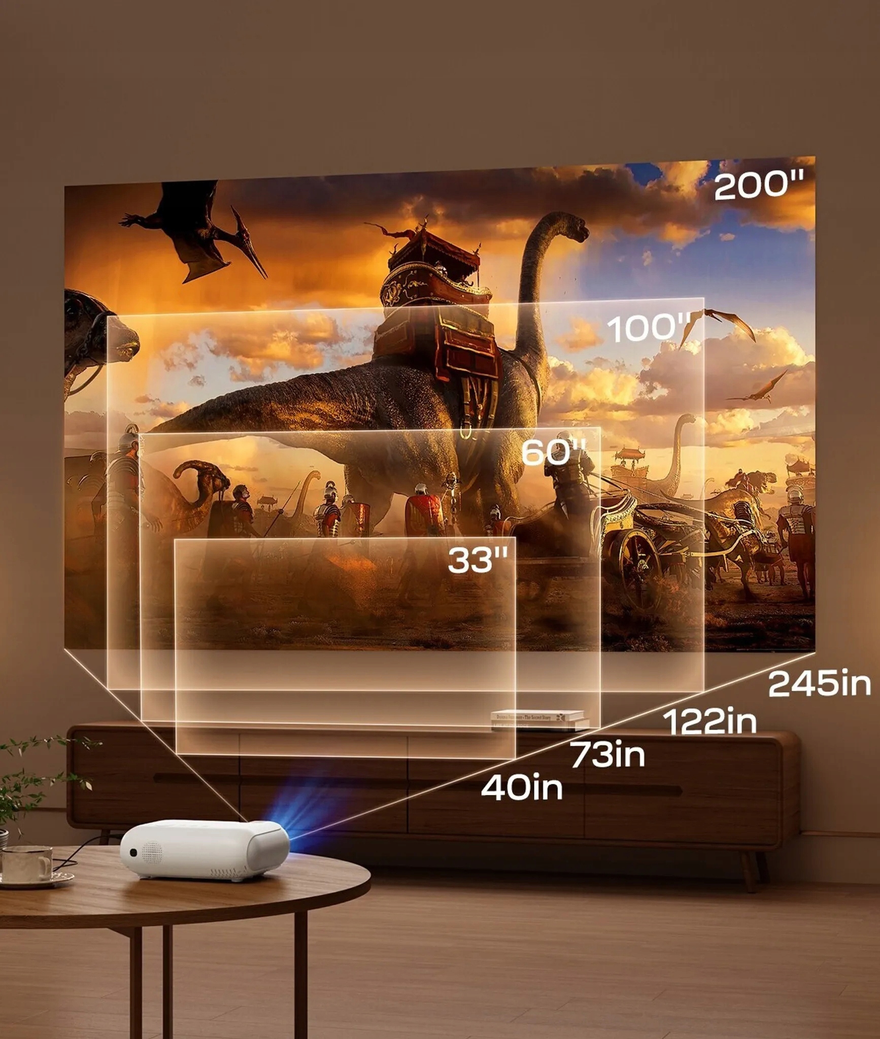 Проектор Wi-Fi и Bluetooth поддерживает расстояние проецирования 0,8-5 метров, максимальный проекционный экран составляет 200 дюймов, функция масштабирования 30% позволяет свободно регулировать размер экрана, не ограничен размером проекционного пространства.