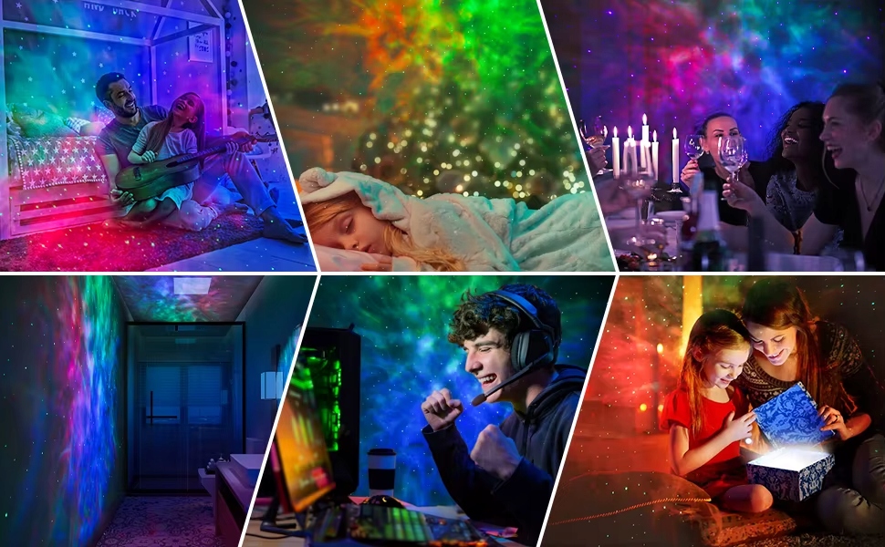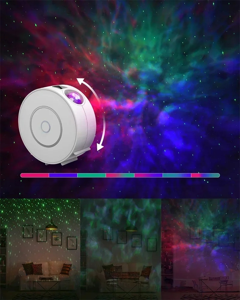 Проектор генерирует динамические проекции туманностей во многих цветовых вариантах — в нижней части изображения представлены 8 примеров эффектов: