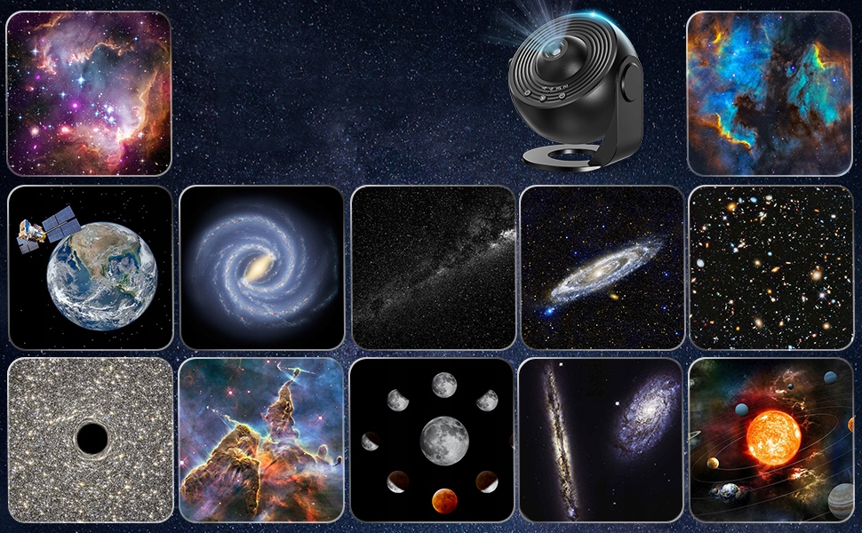 - Проектор звездного неба оснащен 12 галактическими проекционными сценами, поэтому вы можете перенестись в другой виртуальный мир и почувствовать себя в звездном небе, даже когда вы на самом деле там.
