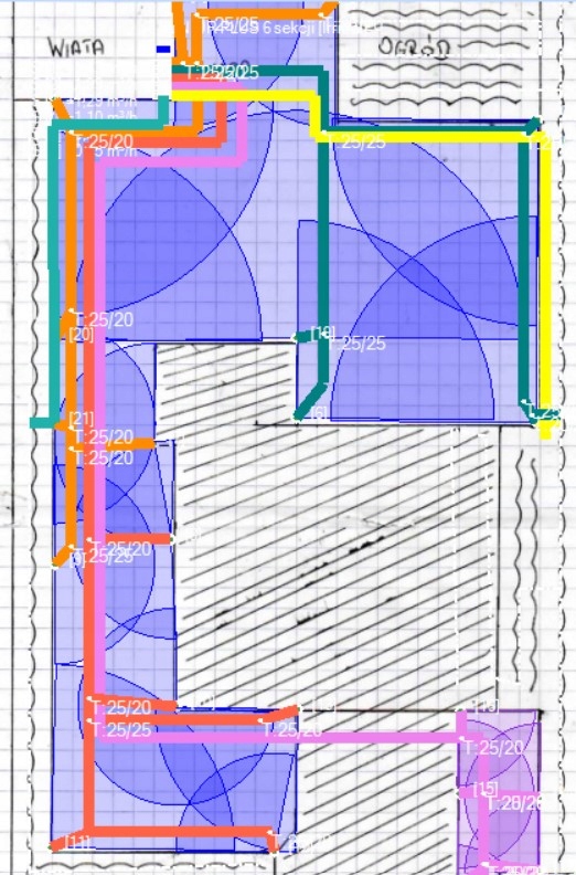 В связи с ограничениями в расходе источника воды, система разделена на соответствующее количество секций, которые будут активироваться с помощью установленных электромагнитных клапанов по программе, заданной на контроллере.
