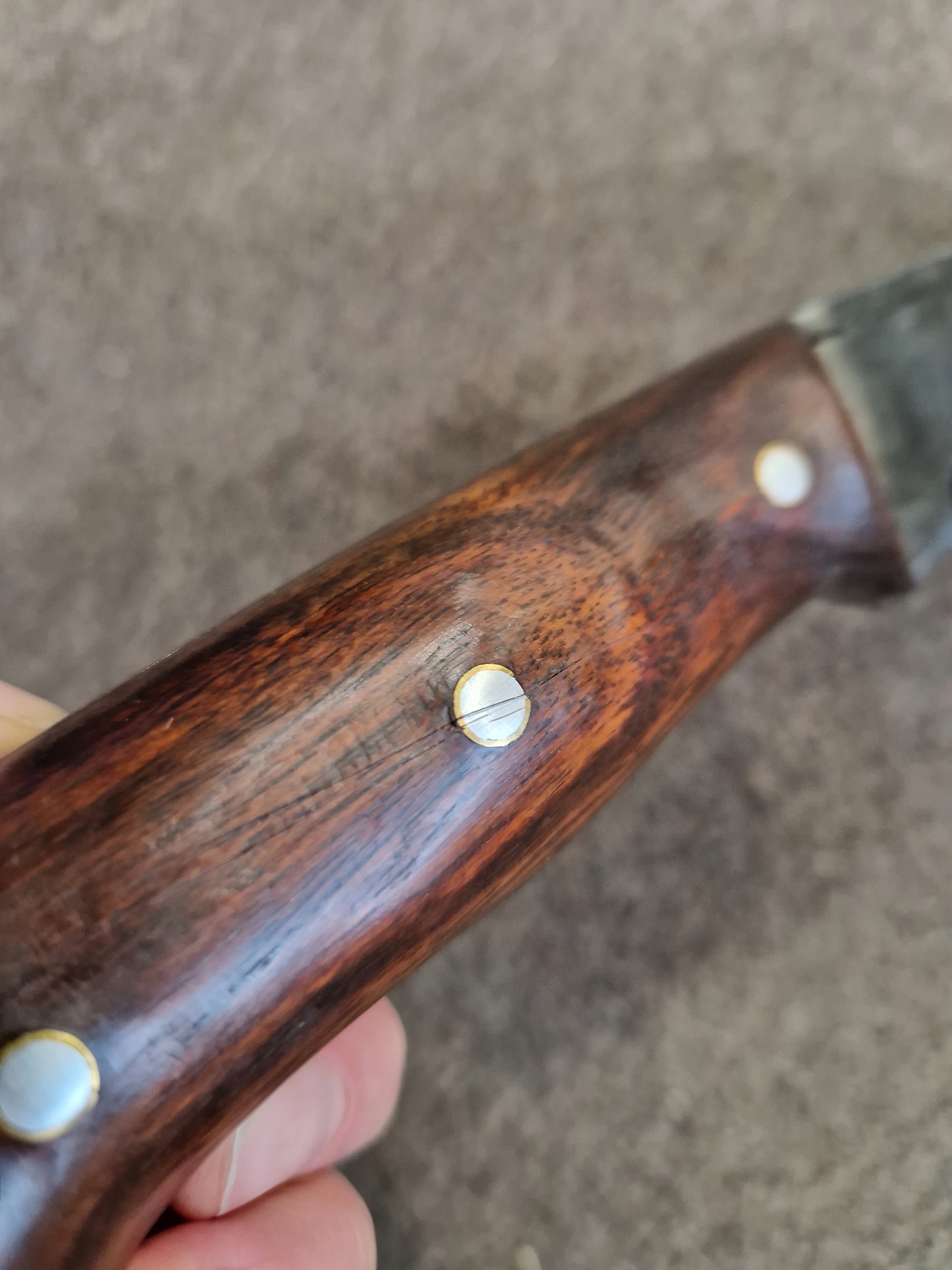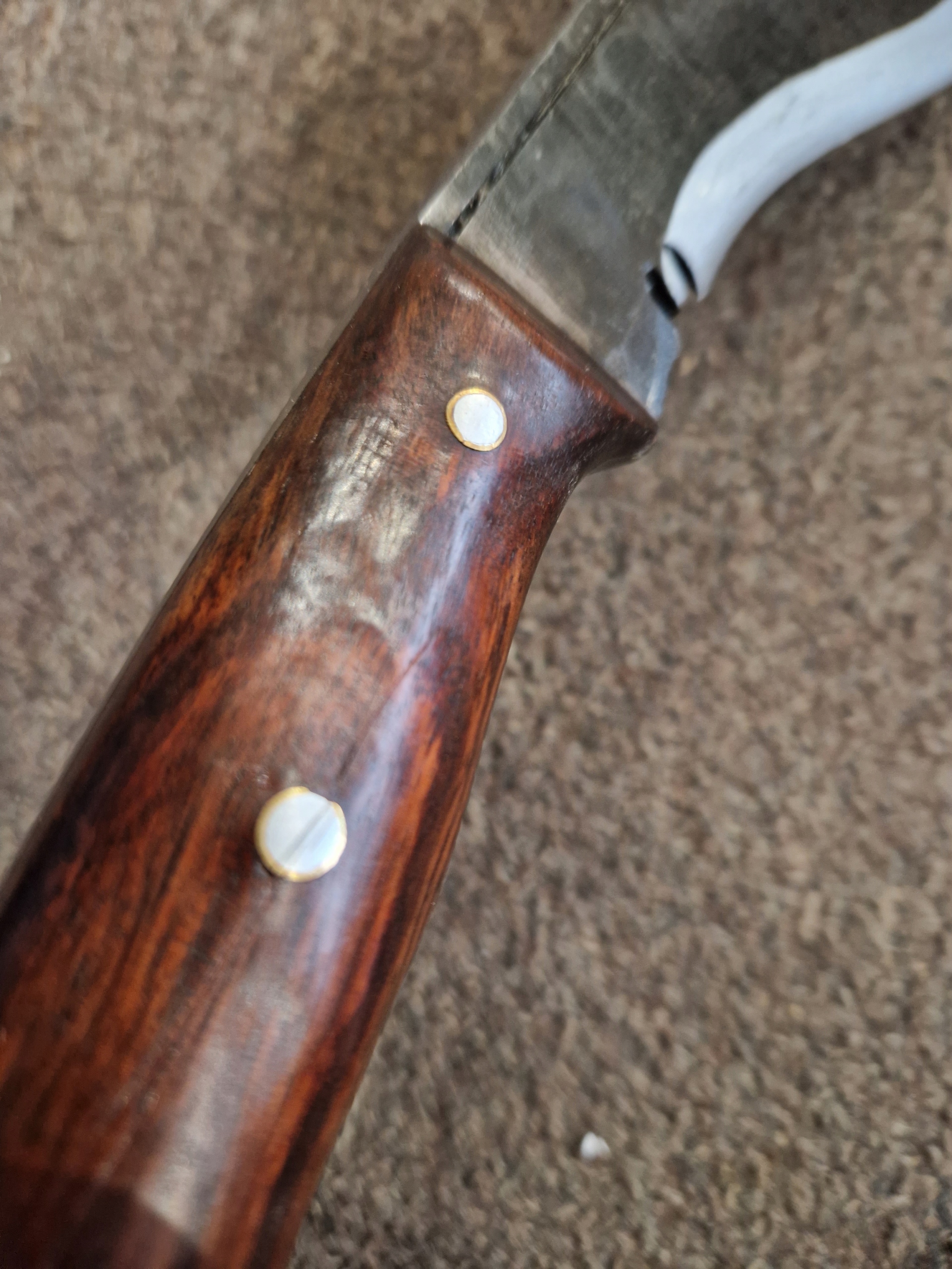 Рукоять с накладкой из палисандра, усилена заклепками, проклеена традиционным непальским клеем Лаха