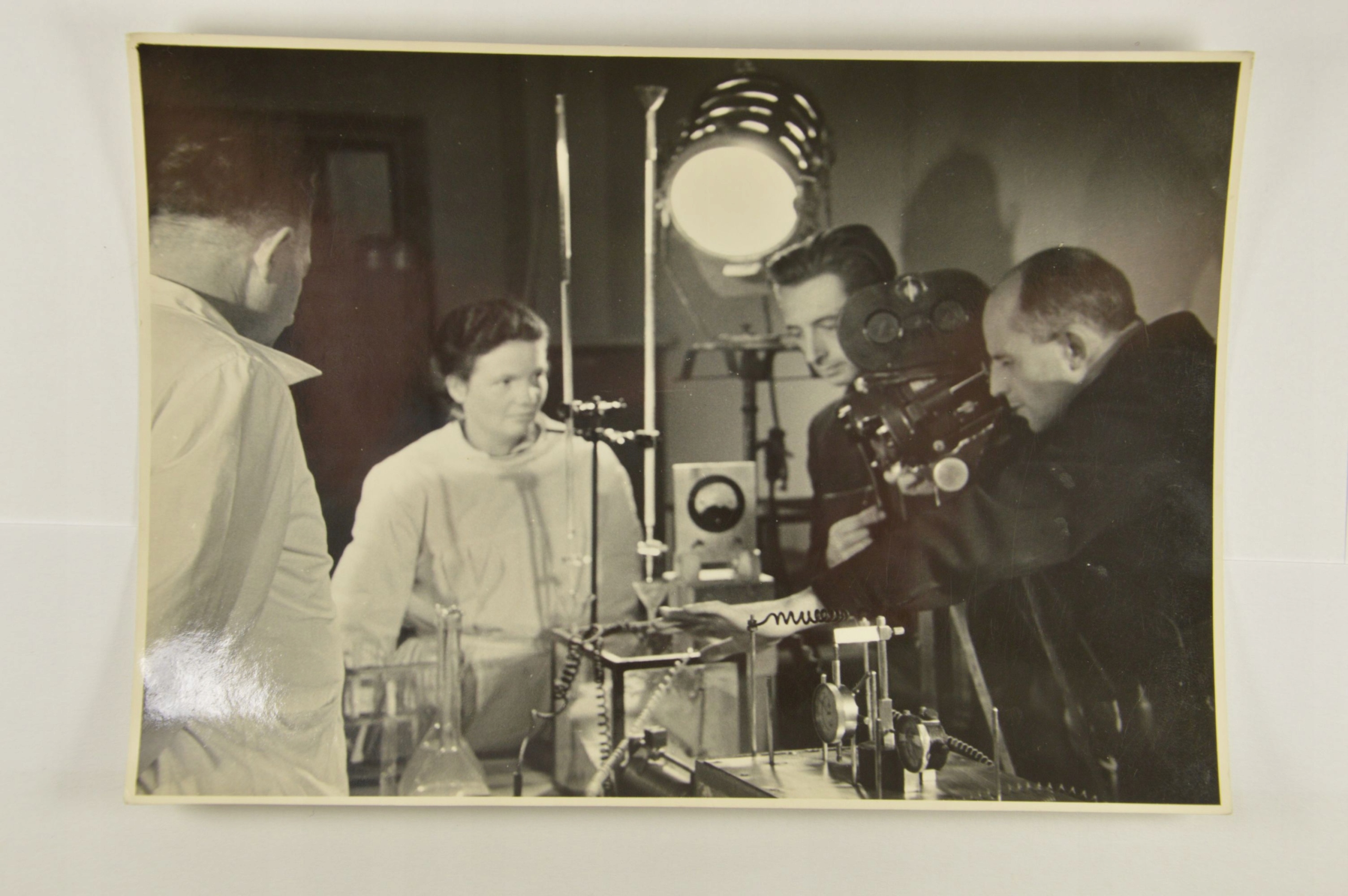 Оригинальная репортажная фотография. На фото: проф. Ромуальд Цебертович в лаборатории Гданьского политехнического университета во время записи отснятого материала – 1960-е гг. Очень интересный, оригинальный документ той эпохи.