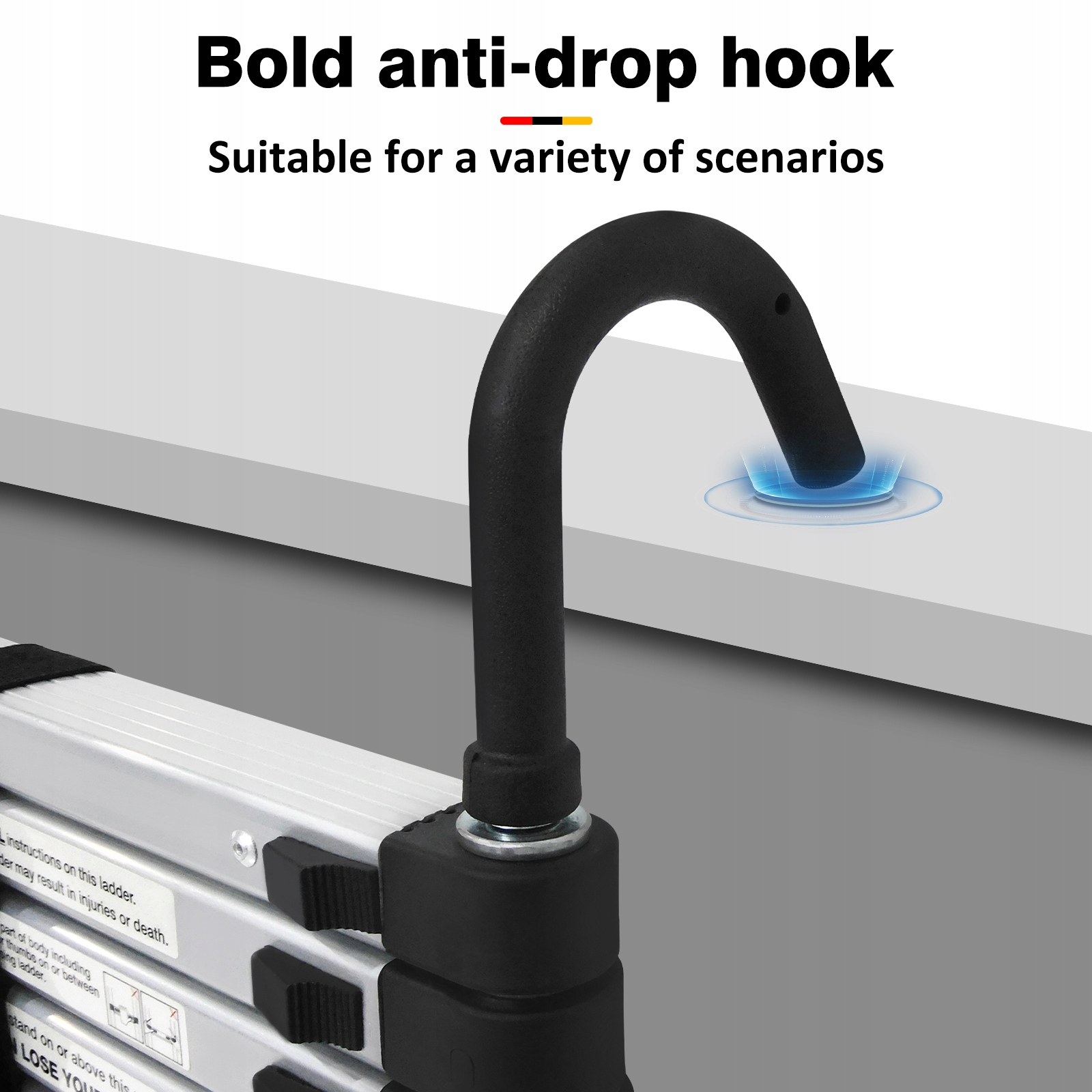Наверху имеется прочный крюк, предотвращающий падение, для вспомогательного крепления на карнизах, балках и т. д. Помогает предотвратить случайное соскальзывание или опрокидывание лестницы за счет добавления замка с ключом для работы над головой.