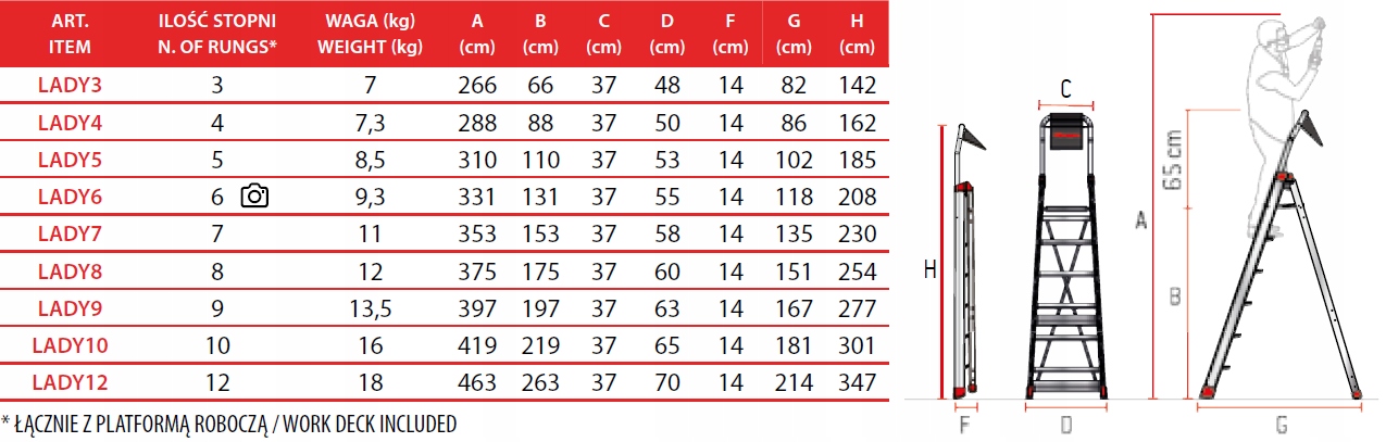 - Рабочая высота в зависимости от модели 264 - 469 см,