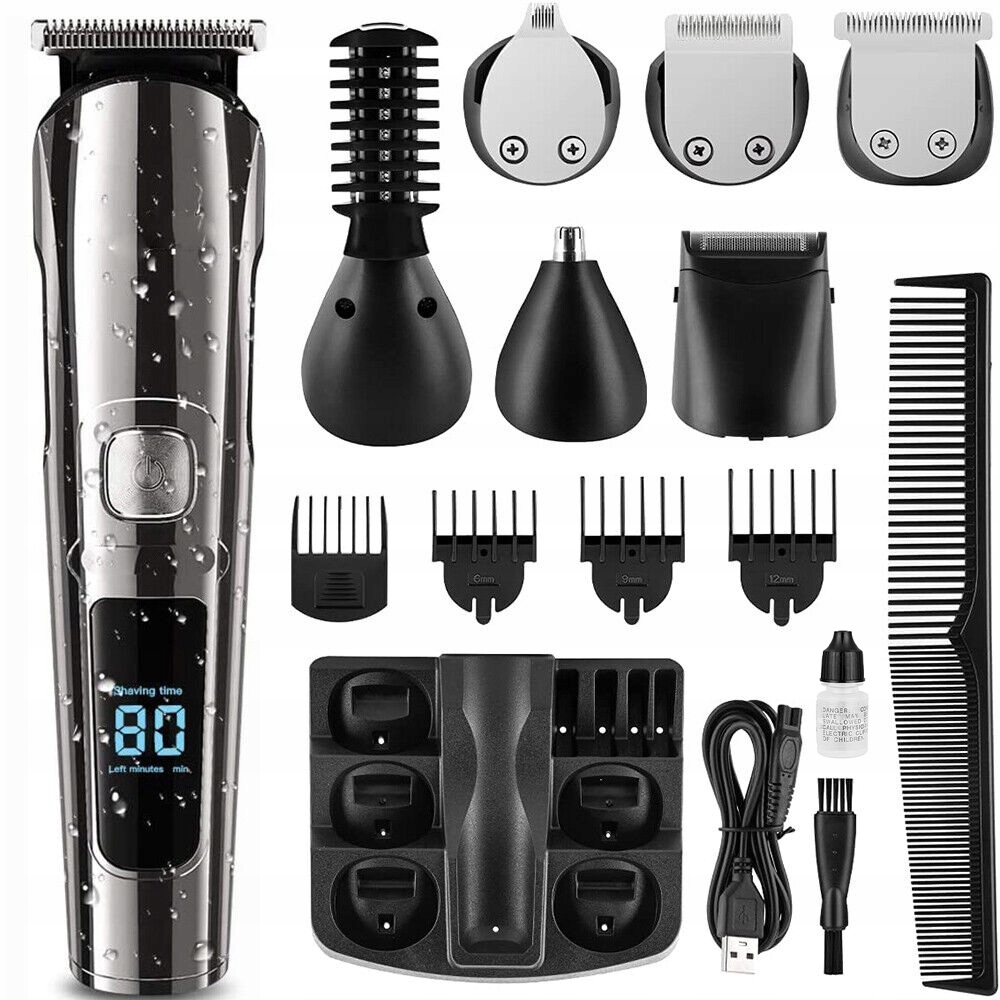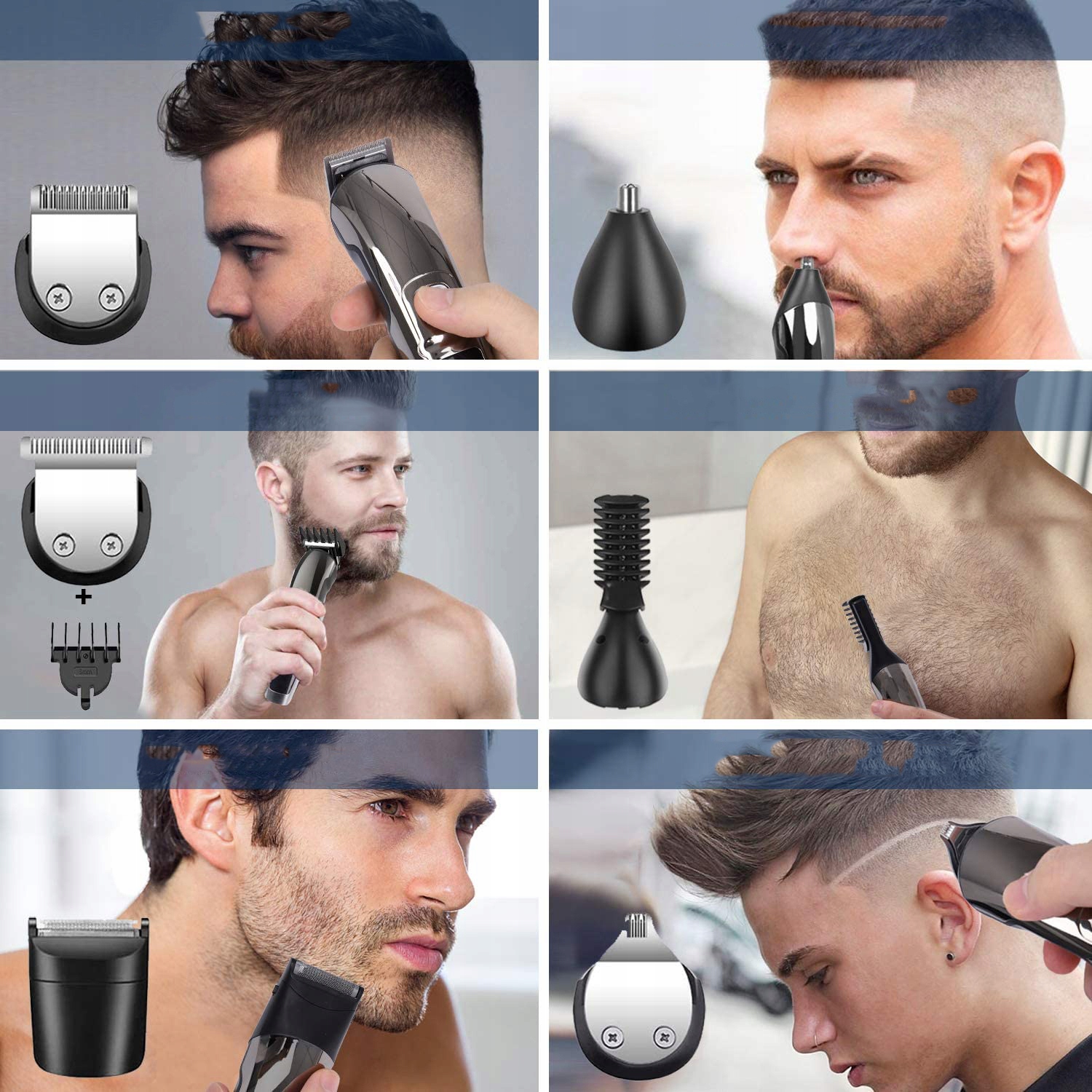 Многофункциональный набор для ухода за волосами 1,11 в 1: Машинка для стрижки волос имеет 5 различных насадок, которые идеально подходят для любых причесок: полноразмерные волосы машинка для стрижки, прецизионный триммер, набор триммеров для носа, триммер для бороды и триммер для волос на теле. 1 * Ручная расческа и триммер для волос поставляются с 4 насадками (3 мм/6 мм/9 мм/12 мм) и 1 регулируемой расческой.