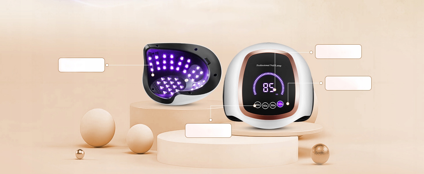 【7,5-дюймовый сенсорный ЖК-экран и 4 настройки таймера】 Большой 7,5-дюймовый сенсорный ЖК-экран этой УФ-светодиодной лампы для ногтей отображает время использования, обрезанный квадратным золотым краем, выглядит более эксклюзивно, стильно и классически. Гибкая настройка 4-х таймеров (низкотемпературный режим 30/60/90/120 секунд) позволяет опытным мастерам маникюра быстро выбрать определенное время отверждения для конкретного лака для ногтей.