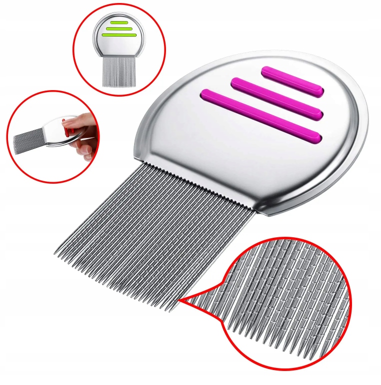 Его особая конструкция состоит из плотных узких зубцов. с бороздками, расположенными близко друг к другу, что позволяет эффективно удалять вшей и гнид. Расческу можно использовать как на сухих, так и на влажных волосах, но рекомендуется использовать ее на влажных волосах с добавлением кондиционера или специального средства для удаления вшей, чтобы облегчить полное удаление любых паразитов (по желанию).