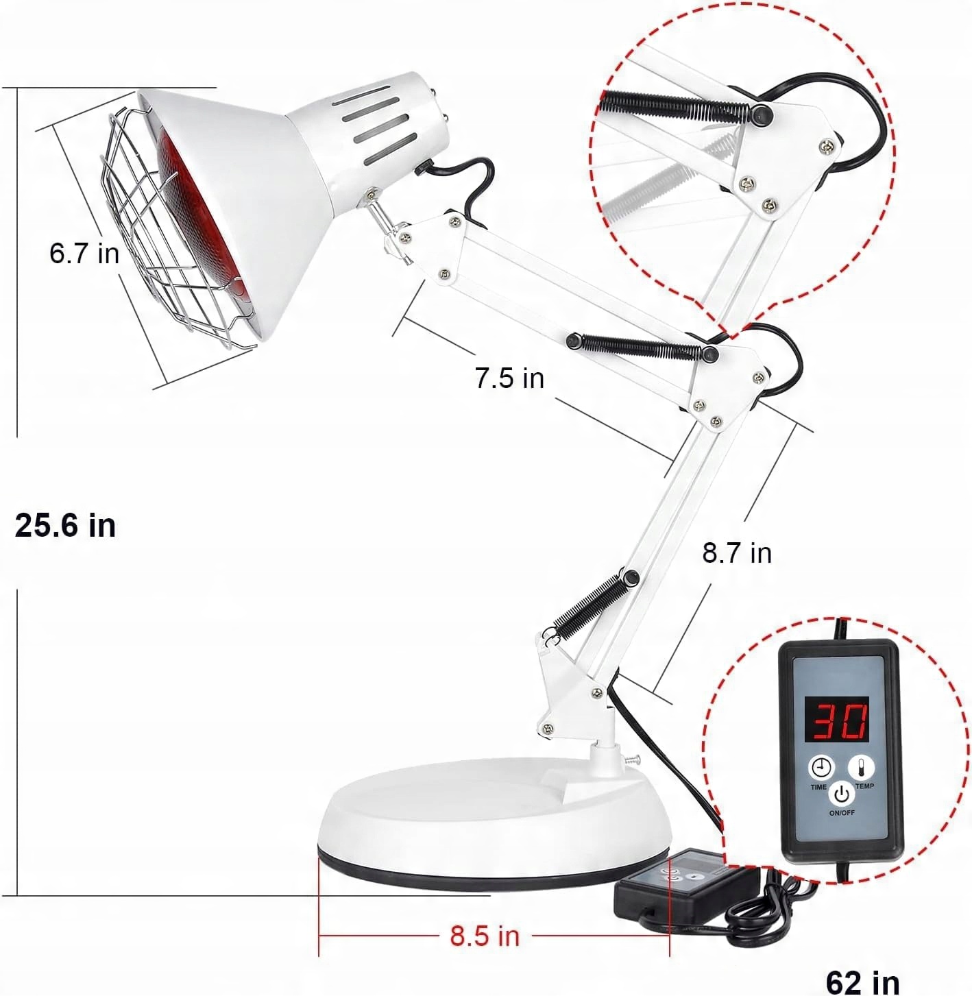 Инфракрасная нагревательная лампа имеет устойчивое и прочное основание с регулируемой шеей и головкой. При необходимости вы можете установить свет в правильном положении и правильном направлении.