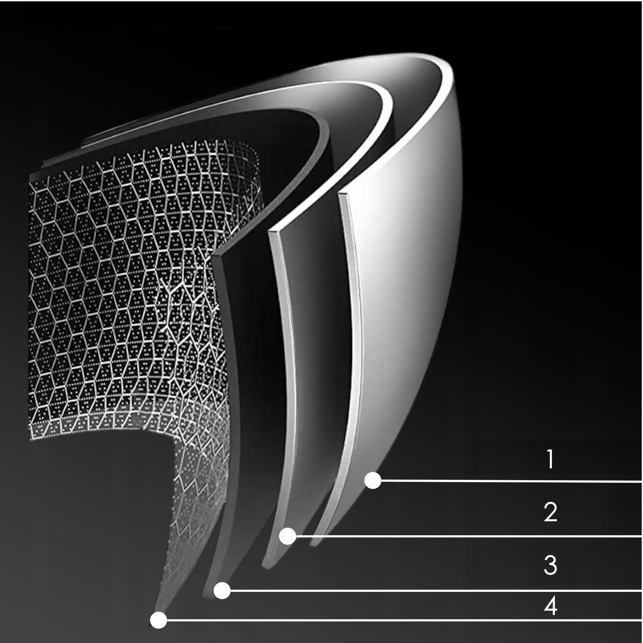 - 4-слойная конструкция: 1 (снизу) — нержавеющая сталь SUS 430 (0,6 мм); 2 - сердечник 1050ALU (1,5 мм); 3 - Нержавеющая сталь SUS 304 (0,4 мм); 4 — Керамическое покрытие с инновационным сотовым рисунком.