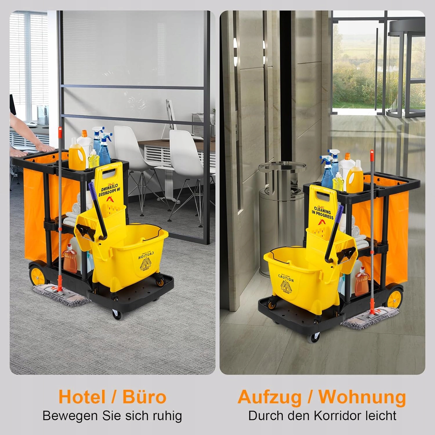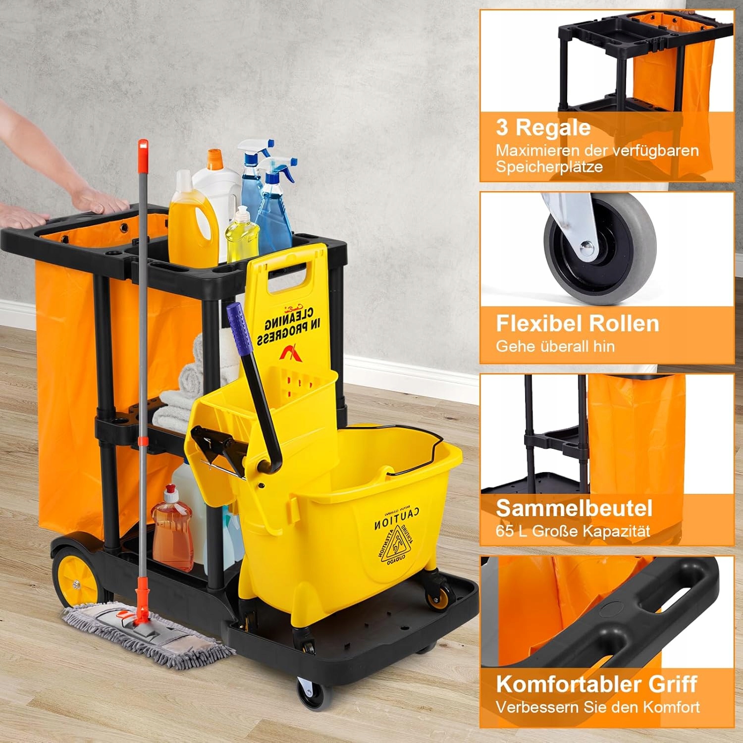очищающая тележка, изготовленная из прочного материала PP, и пластиковая железная рама, которая устойчива к трещинах, очистке и коррозии и способна поддерживать максимум 150 кг. Сплошная конструкция делает очистку более эффективной. Диапазон доставки: 1 x черная очищающая тележка и 1 х желтого пакета для мусора (инструменты для чистки не находятся в сфере доставки)