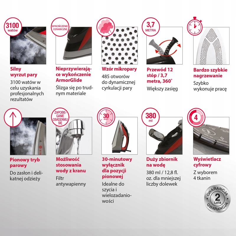 | ВЫСОКАЯ ПАРОВАЯ МОЩНОСТЬ | МОЩНОСТЬ 3100 Вт | ARMORGILDE АНТИПРИГАРНЫЕ ПОКРЫТИЯ | ВЕРТИКАЛЬНЫЙ ВЫПУСК ПАРА | КАБЕЛЬ 3,7 М | ЦИФРОВОЙ ДИСПЛЕЙ| ВЫБОР ТКАНИ ДЛЯ ГЛАЖКИ | ОПРЫСКИВАТЕЛЬ |