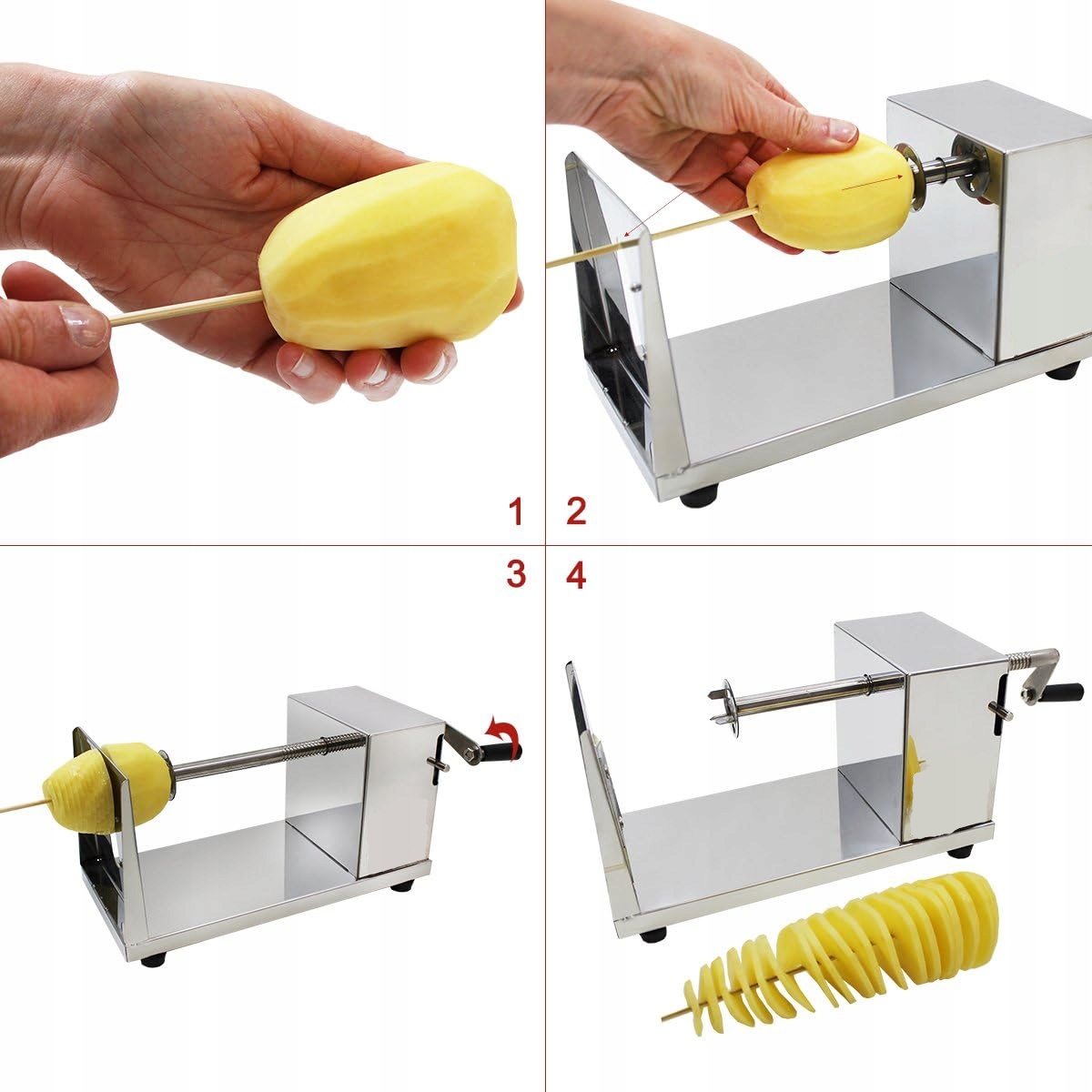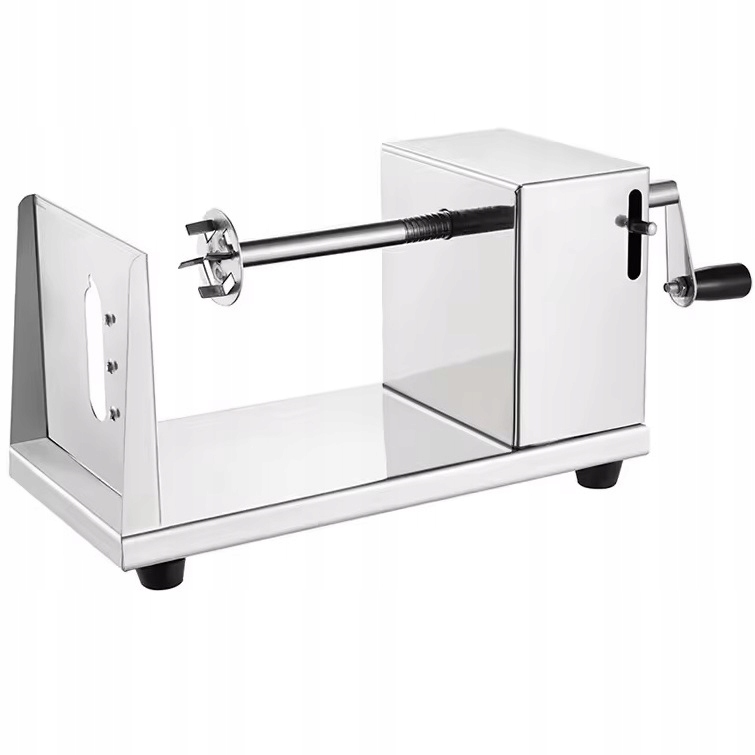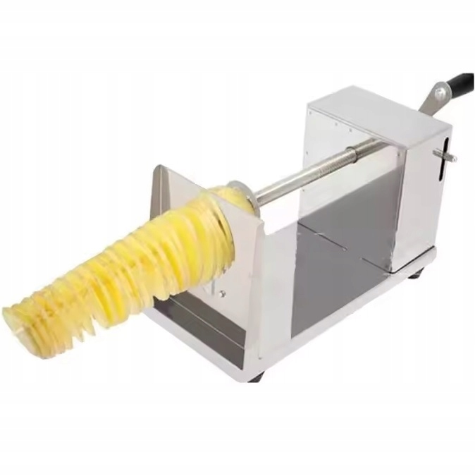 Машина Brunbeste для создания скрученного картофеля на палочке. Прочная конструкция из нержавеющей стали. Станок имеет стальное лезвие (+ 2 запасных) и 4 резиновые нескользящие ножки. Устройство работает от кривошипа. Машину легко содержать в чистоте. Устройство имеет рычажную блокировку.