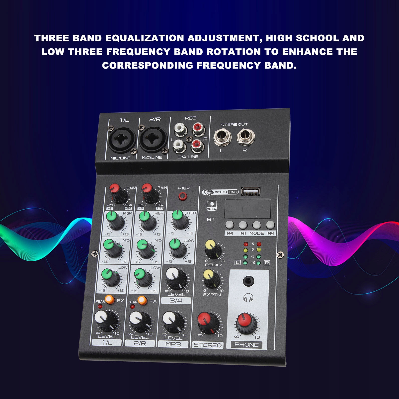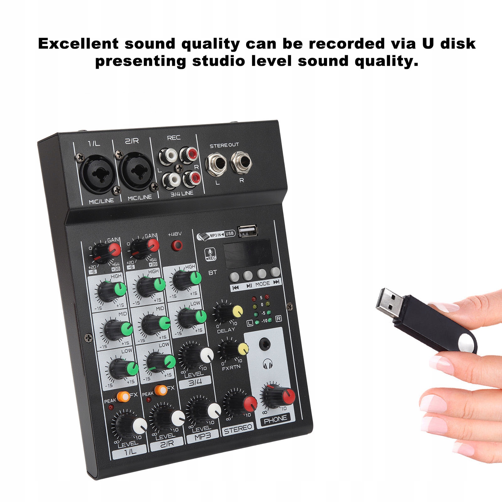 1. Звук: 4-канальный микшерный пульт с высокоскоростным DSP может автоматически корректировать недостатки вокала и воспроизводить округлый, трехмерный звук хорошего вокала, обеспечивая качество звука, соответствующее стандартам студийного уровня, позволяя пользователям получать больше удовольствия от музыки. 2. Режим подключения: встроенный модуль BT обеспечивает плавное соединение с устройствами BT. Пользователям просто нужно переключиться в режим BT, чтобы удобно наслаждаться любимой музыкой. 3. Функция записи: 4-канальный микшерный пульт с функцией записи на U-диск, пользователи могут записывать на U-диск для превосходного качества звука, обеспечивая профессиональное качество звука студийного уровня, так что пользователи могут не только записывать свои собственные выступления в любое время или работать. , но также записи можно сохранить как ценную память. 4. Персонализированная настройка: 4-канальный микшерный пульт, оснащенный тремя настройками эквалайзера, пользователи могут основываться на музыкальных предпочтениях и характеристиках, свободное вращение для улучшения соответствующей полосы высоких, средних и низких частот, что делает звук более полным и четким для удовлетворения потребностей разные стили и случаи. 5. Многоинтерфейсный дизайн: 4-канальная микшерная консоль со стереоканалом входа и выхода и другими интерфейсами, ее можно легко подключить к различным видам звукового оборудования, такого как микрофоны, динамики, музыкальные инструменты и т. д., не только для улучшения качества звука. эффект, но и для лучшего удовлетворения профессиональных потребностей пользователей.