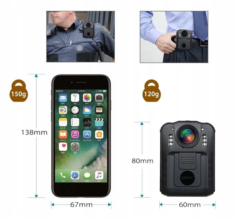 Камера водонепроницаема и устойчива к падениям и ударам. Благодаря большой памяти и большой батарее время работы камеры в зависимости от установленного разрешения составляет до 6 часов. Полицейская камера оснащена ИК-диодами с дальностью действия 10 м и качественным микрофоном. Благодаря специальному кодеку при архивировании видеоматериалы можно сжимать для уменьшения объема памяти, необходимой для хранения.