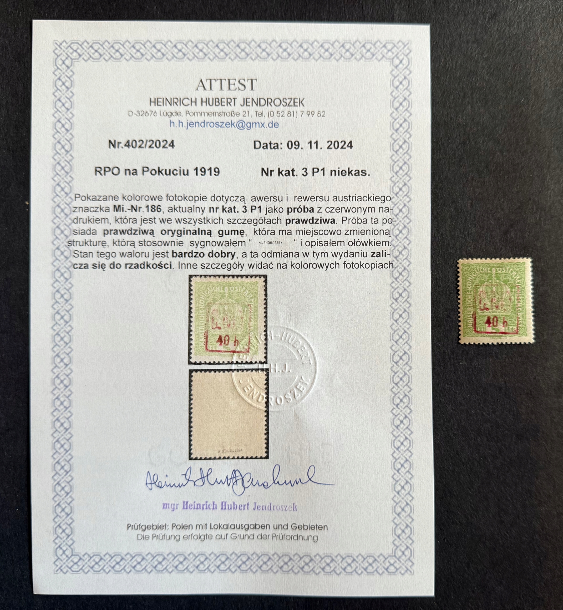 Попытка ценить Fi 3 P1 - Выпуск оккупационного поста в регионе Pokucie Kothomyja - равномерное положение в отличном поведении - редкость, сертификат, красивая оригинальная резина, полная перфорация, равное центрирование рисунка, практически идеальное состояние, Значение каталога Fischer Tom II 2024 - 2500 PLN, Я жду 7 дней за оплату с даты торга, после этого периода аукцион отменен, и товар снова переходит к продажам