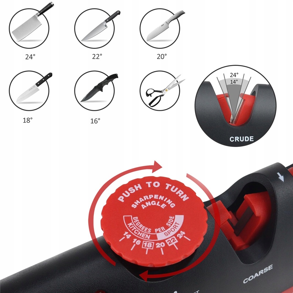 Точилка для ножей имеет 6 настроек угла (14°, 16°, 18°, 20°, 22°, 24°), для регулировки угла заточки достаточно повернуть ручку. Такая гибкость делает его отличным выбором для заточки широкого спектра ножей, включая японские, профессиональные, поварские и даже карманные ножи.
