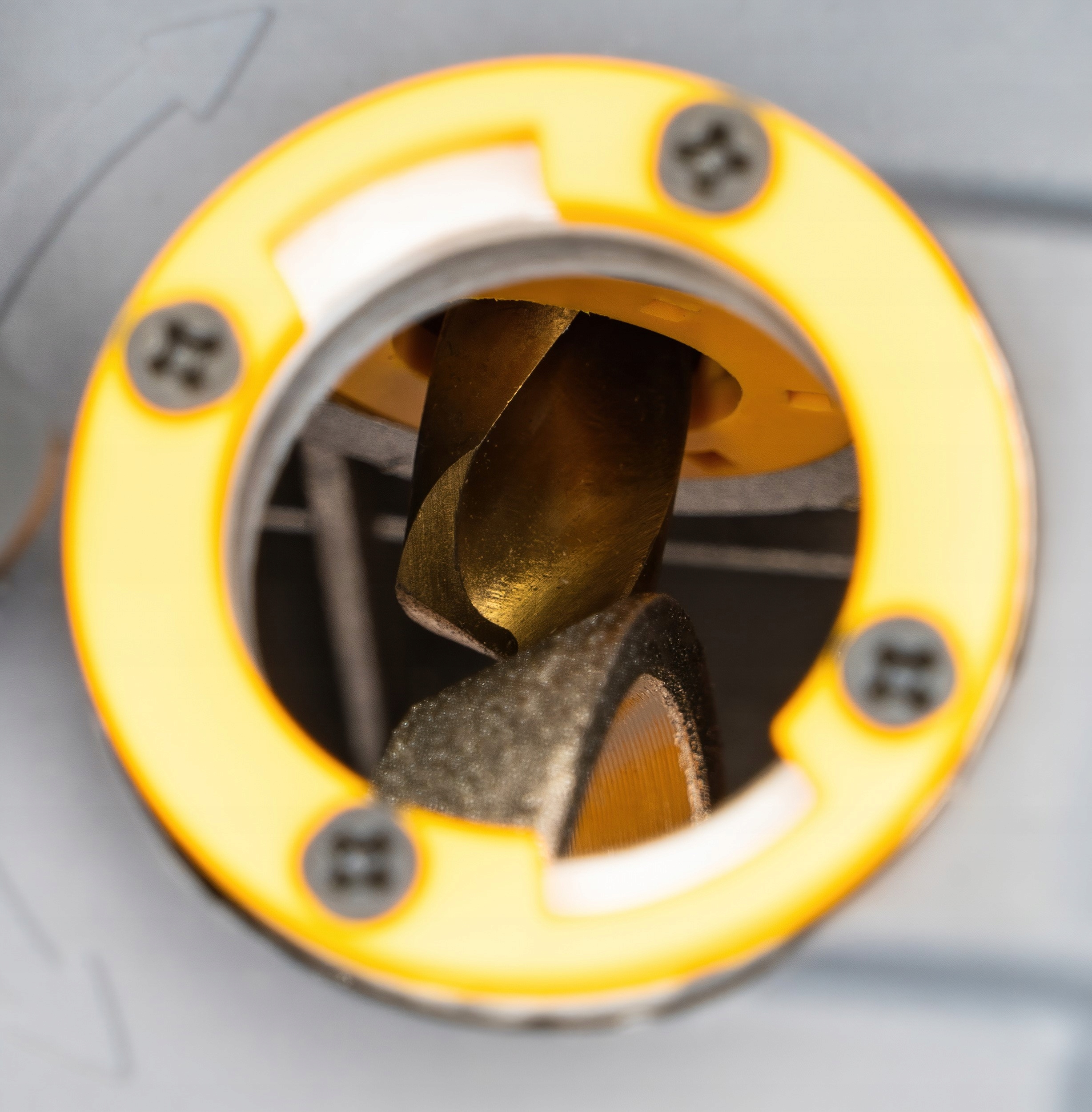 - Гнездо (боковое шлифовальное отверстие) с заданным крутящим моментом для головки для точной заточки обеих сторон кромки сверла.