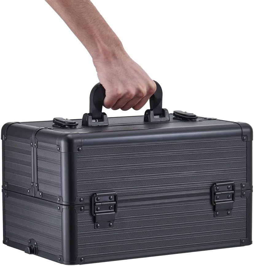 Профессиональный чемоданчик для макияжа на колесиках с выдвижным ящиком и замком, черный