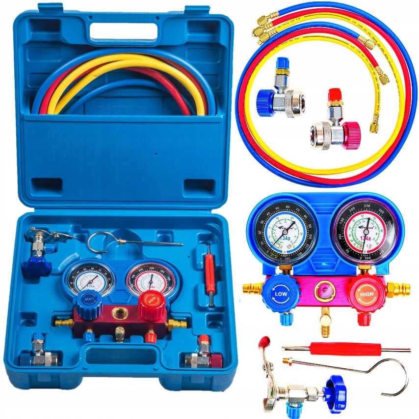 набор манометра для автомобильного и стационарного кондиционера на факторе фактор R134a , вместе с тремя красочными шлангами с длиной 90 см и быстрыми связями автомобильный кондиционер. Тестер позволяет вам диагностировать потенциал Разрушения кондиционера, сравнивая давление страницы высокое давление с высоким давлением и низким давлением с Спецификация системы кондиционирования воздуха. Тестер кондиционера, спасибо Желтый сервисный провод также будет использоваться во время Ополос и заполнение систем кондиционирования воздуха. Метр до Кондиционер используется в системах кондиционирования воздуха, которые поддерживают Заводы на обслуживании, где кормятся кабелями кондиционирования воздуха выше 12 атмосферы.