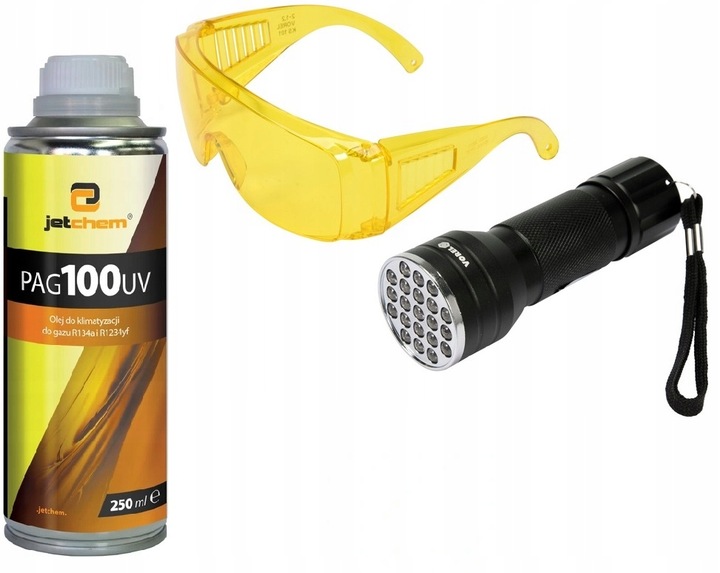 фонарик Ультрафиолетовое ультрафиолетовое излучение, предназначенное для обнаружения утечек систем кондиционирования воздуха машина с контрастным агентом. Очки включены Защита от ультрафиолетового излучения, удовлетворения европейских требований Директивы на оборудование для личной защиты.