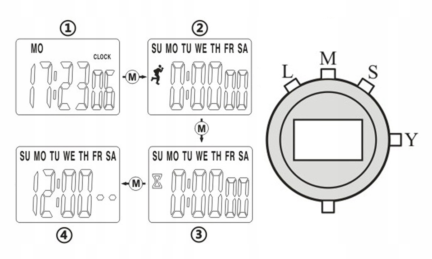 ① Использование времени: нажмите кнопку [M] слева от режима времени один раз, и отобразится значок режима секундомера. В режиме секундомера нажмите [S], чтобы начать отсчет времени, затем нажмите [S], чтобы приостановить отсчет. Нажмите [S] в режиме паузы. Клавиша L] очищает 0. Нажмите клавишу [S] еще раз в состоянии паузы, чтобы отсчитать время. ② Использование сегментированного отсчета времени: в режиме секундомера нажмите клавишу [S], чтобы начать отсчет времени. Нажмите клавишу L, чтобы приостановить первую группу синхронизации. В это время на экране отобразится время первой группы, затем нажмите клавишу L, чтобы отобразить вторую группу процессов синхронизации, снова нажмите клавишу L, чтобы отобразить второй набор времени, снова нажмите клавишу [S], чтобы приостановите отсчет времени и нажмите клавишу L после паузы, чтобы очистить 0.