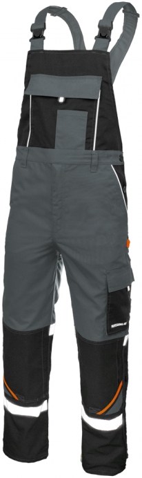 Рабочий комбинезон Art-Mas Professional Ref изготовлен из очень прочного холщового полотна, состоящего из 65 % полиэстера и 35 % хлопка с высокая плотность 270 +/- 10 г/м². У них тройные швы и прочное плотное переплетение. наколенники позволяют использовать сменные наколенники. Брюки имеют светоотражающие элементы спереди и сзади, светоотражающие ленты соответствуют требованиям стандарта EN ISO 20471:2013 «Одежда повышенной видимости» пункт 6.1, 6.2. Регулируемая длина подтяжек позволяет идеально подогнать брюки по фигуре.