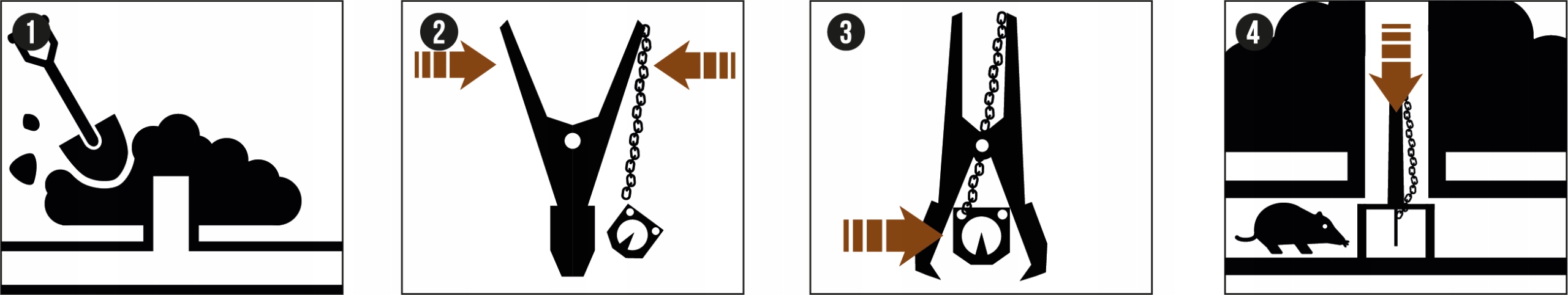 Для этого необходимо выкопать яму позволяющий свободно разместить ловушку на месте холмика или коридора, по которому движется крот. Затем ловушку следует затянуть и зафиксировать запорной пластиной.