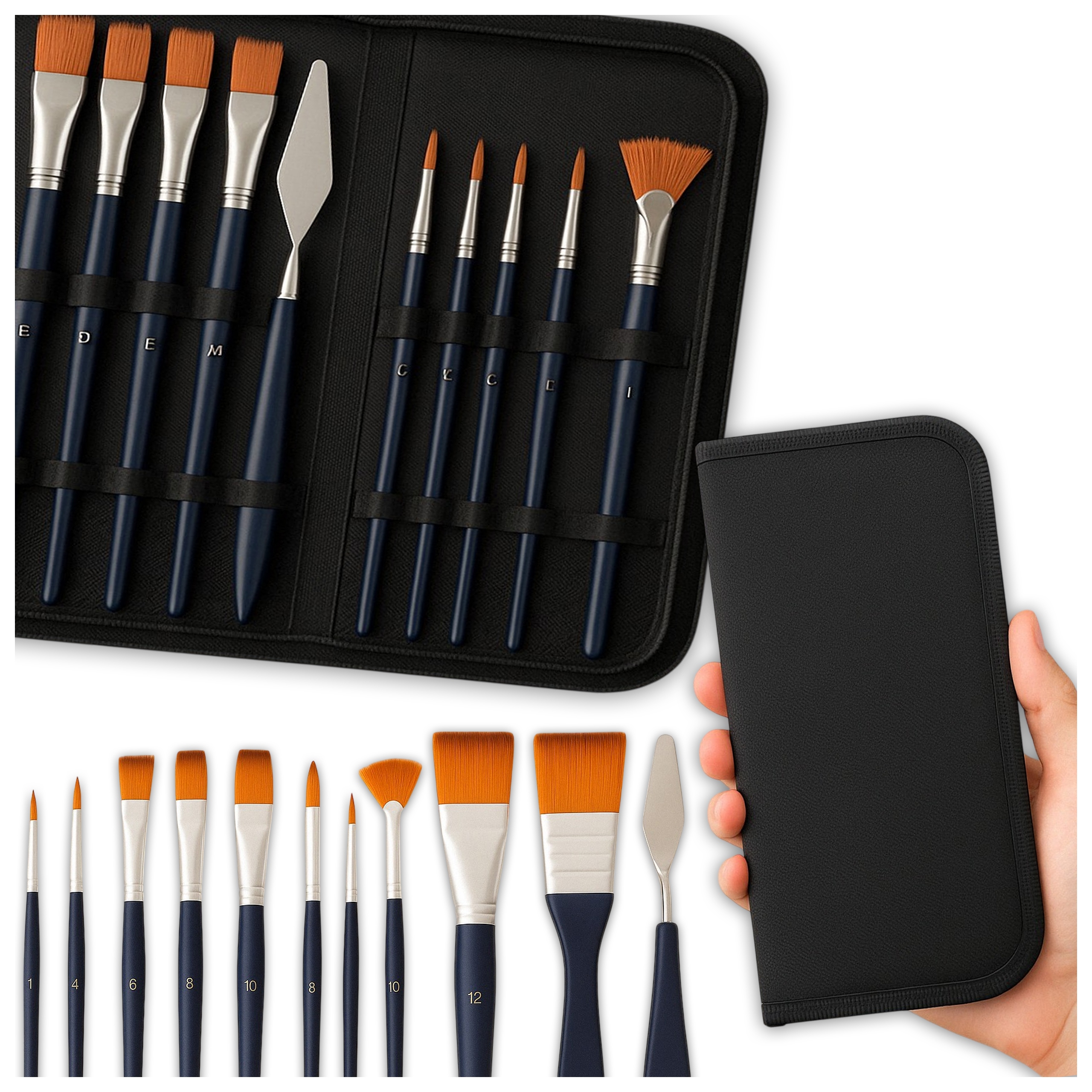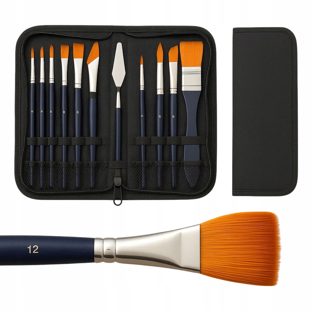 - Набор содержит 10 кистей в различных размерах и формах - круглые, плоские, наклонные - и шпатель и чехол.