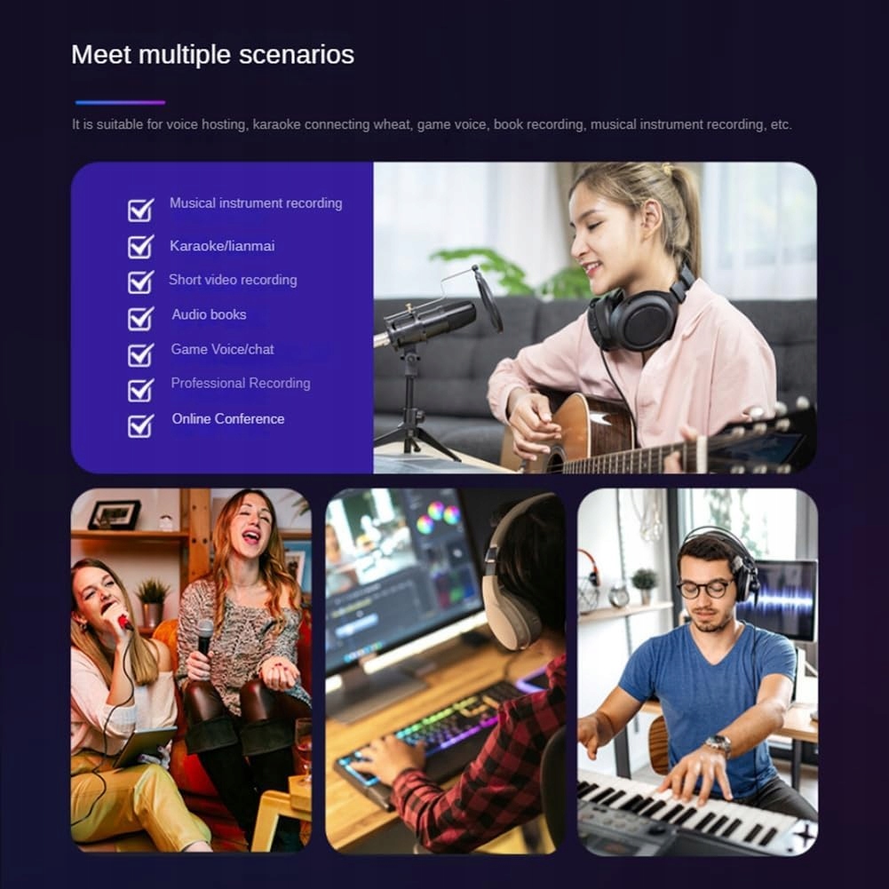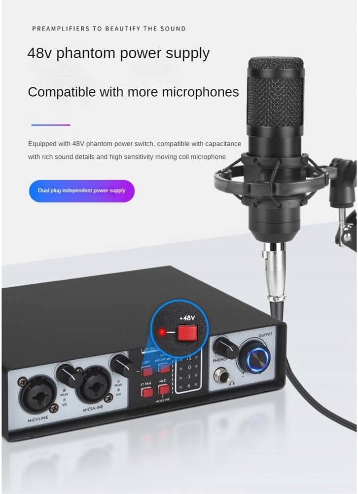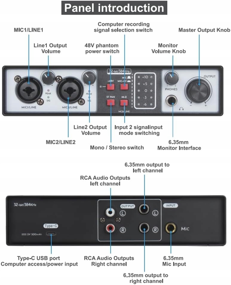 Звуковая карта высокой четкости с 2 входами и 2 выходами: низкий уровень искажений, низкий уровень шума, микрофонный предусилитель, поддерживает высокую частоту дискретизации 32 бит/384 кГц, без проблем записывает каждую деталь звука.