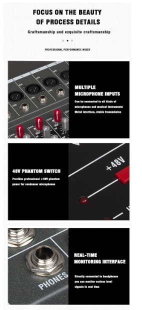 Совместимость микшера с различными устройствами, такими как комбинация микрофона и инструментов, подходящая для семейного КТВ, выступлений групп, мероприятий в кампусе, конференций и других мероприятий. Аудио поддерживает проводное/беспроводное/конденсаторное подключение микрофона/инструмента, подходящее для домашнего КТВ, выступлений групп, вечеринок в кампусе, конференций и других мероприятий.