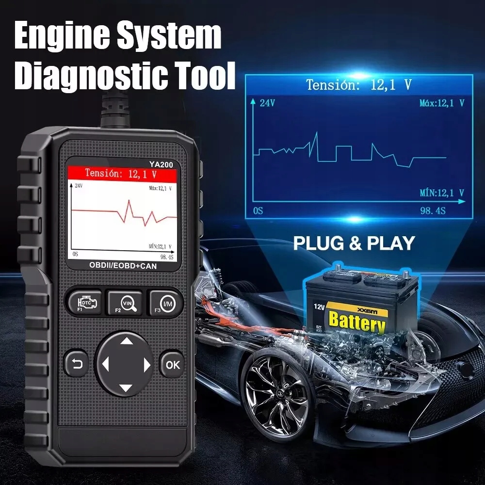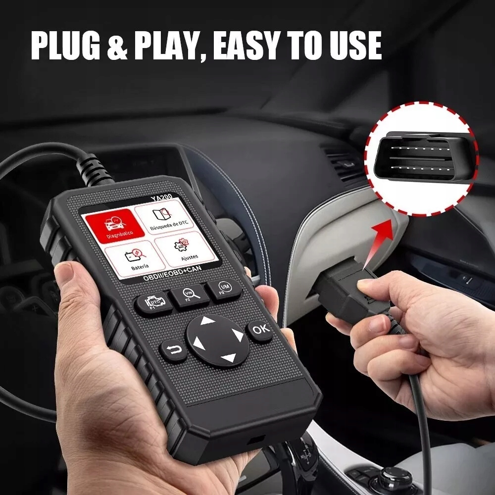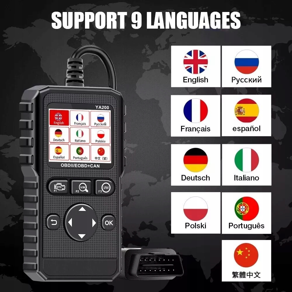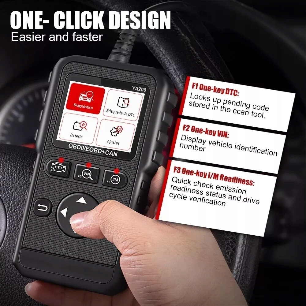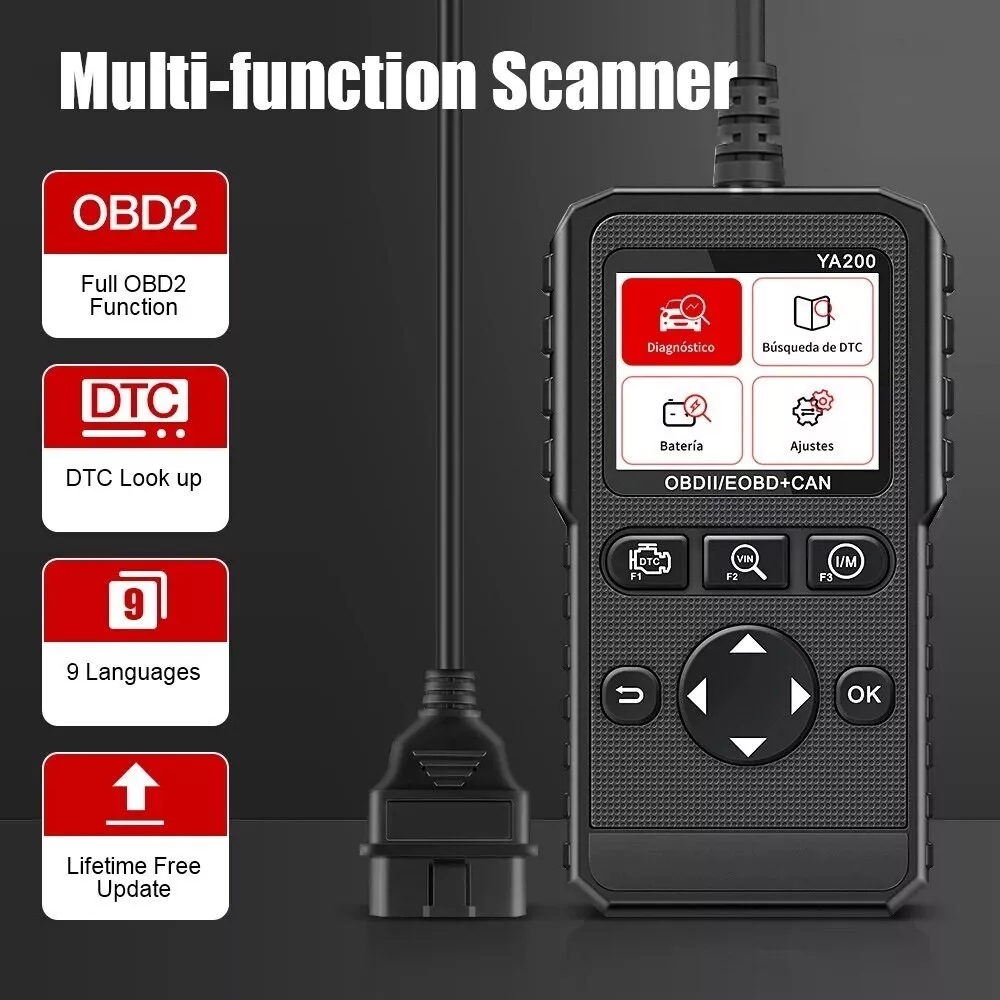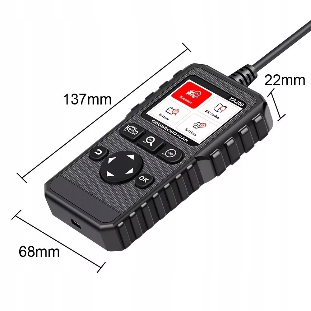 YA200 - это считыватель кодов с полными функциями OBD2: считывание/очистка кодов DTC, проверка готовности I/M, просмотр потока данных в реальном времени, просмотр данных в режиме стоп-кадра, проверка датчика O2, проверка системы бортового монитора, проверка системы EVAP, поиск информации о транспортном средстве. с расширенной функцией поиска DTC.