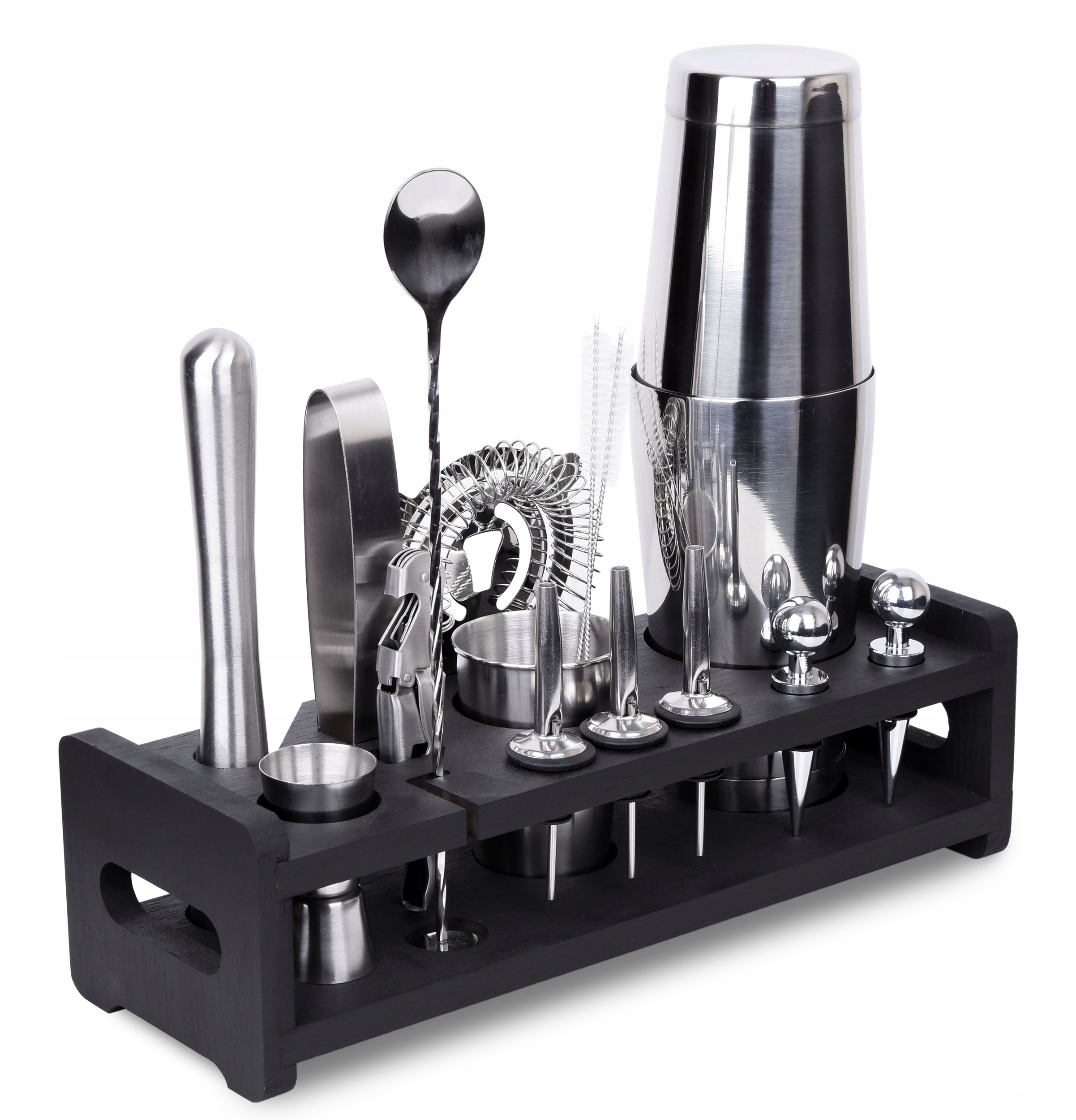 Вы устраиваете вечеринку и хотите удивить своих гостей? Набор бармена поможет начать вечеринку и приготовить оригинальные, интересные напитки. Каждый элемент набора изготовлен из нержавеющей стали высочайшего качества. >, благодаря чему не меняет вкус напитков. В набор входят 17 элементов: 16 аксессуаров из нержавеющей стали и подставка из черного бамбука.