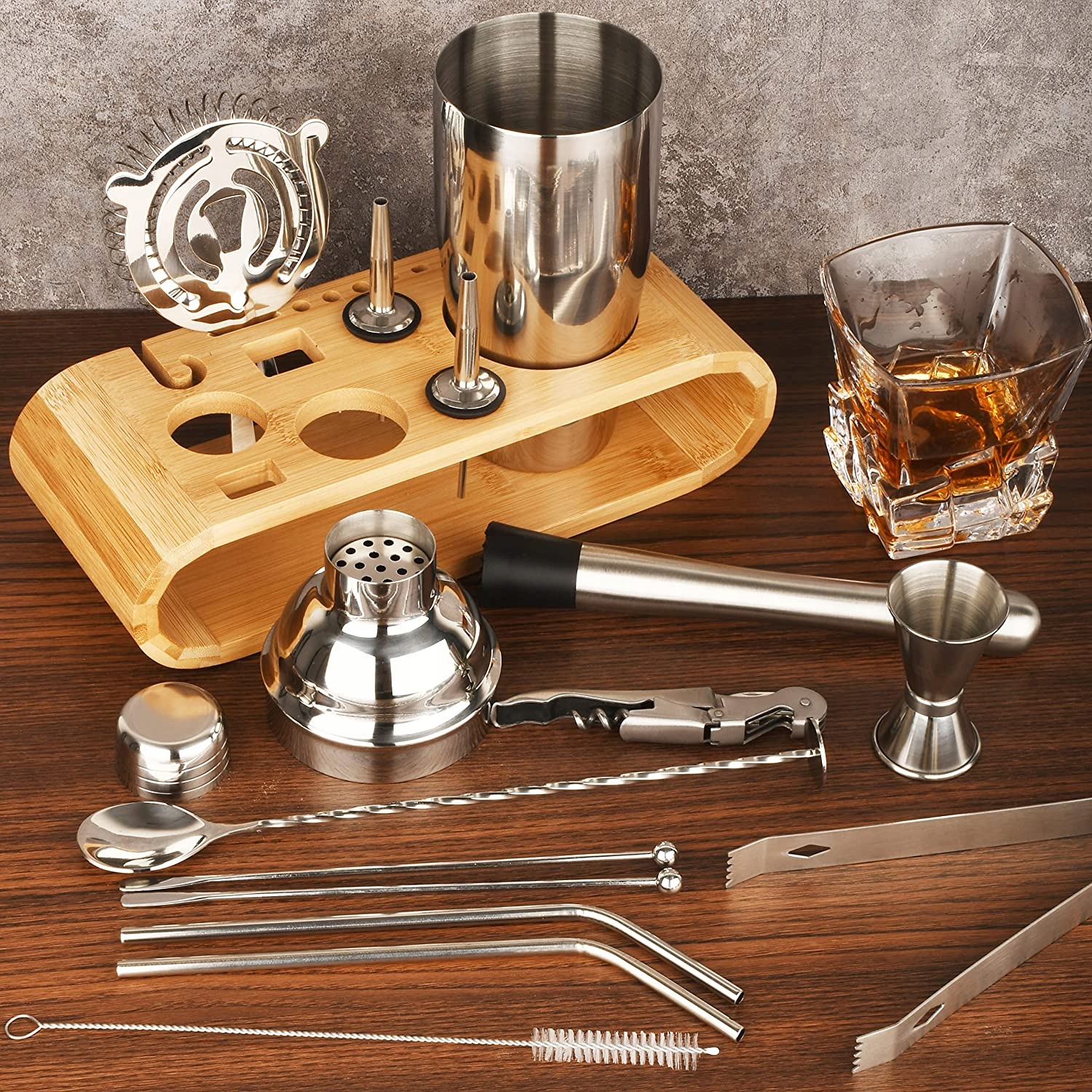 - Набор для бармена упрощает миксологию профессионального уровня. Наполните свой домашний бар большим количеством барных аксессуаров, все это расположено на обтекаемой бамбуковой подставке.