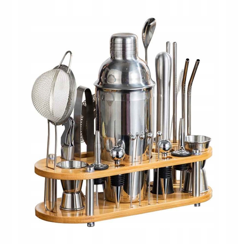 - Полный набор для бармена: содержит до 25 аксессуаров, в том числе шейкер на 750 мл, мадлер, насадки, щипцы для льда, барменское ситечко, барная ложка и многое другое.