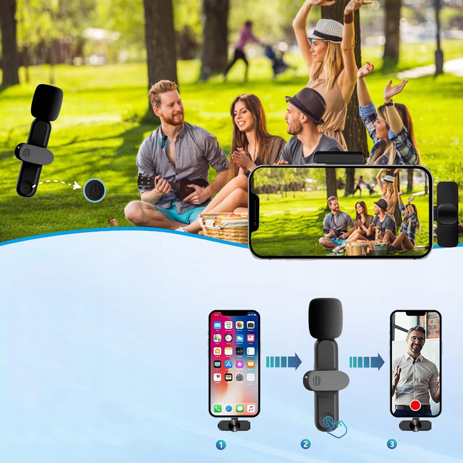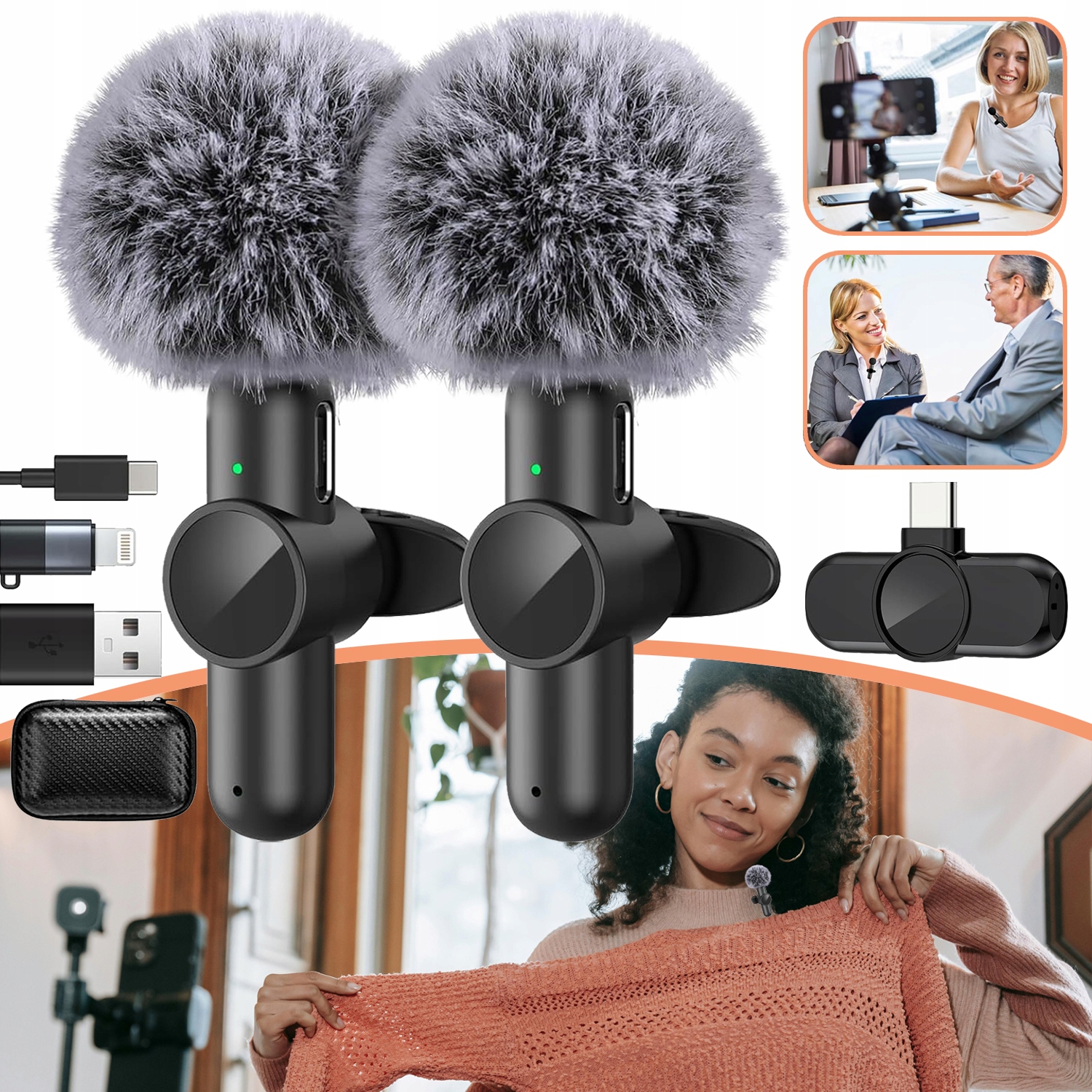 🔊🔊🔊【Беспроводной петличный микрофон】 Этот комплект беспроводного петличного микрофона включает в себя 2 передатчика + 1 приемник и идеально подходит для записи видеозвонков и интервью с двумя людьми, независимо от того, какой телефон iPhone или Android USB-C вы используете. Петличный микрофон легко настраивается и не требует громоздких приложений: просто выберите адаптер, подходящий для вашего устройства, подключите приемник к устройству, включите портативный микрофон, и он будет автоматически подключен.