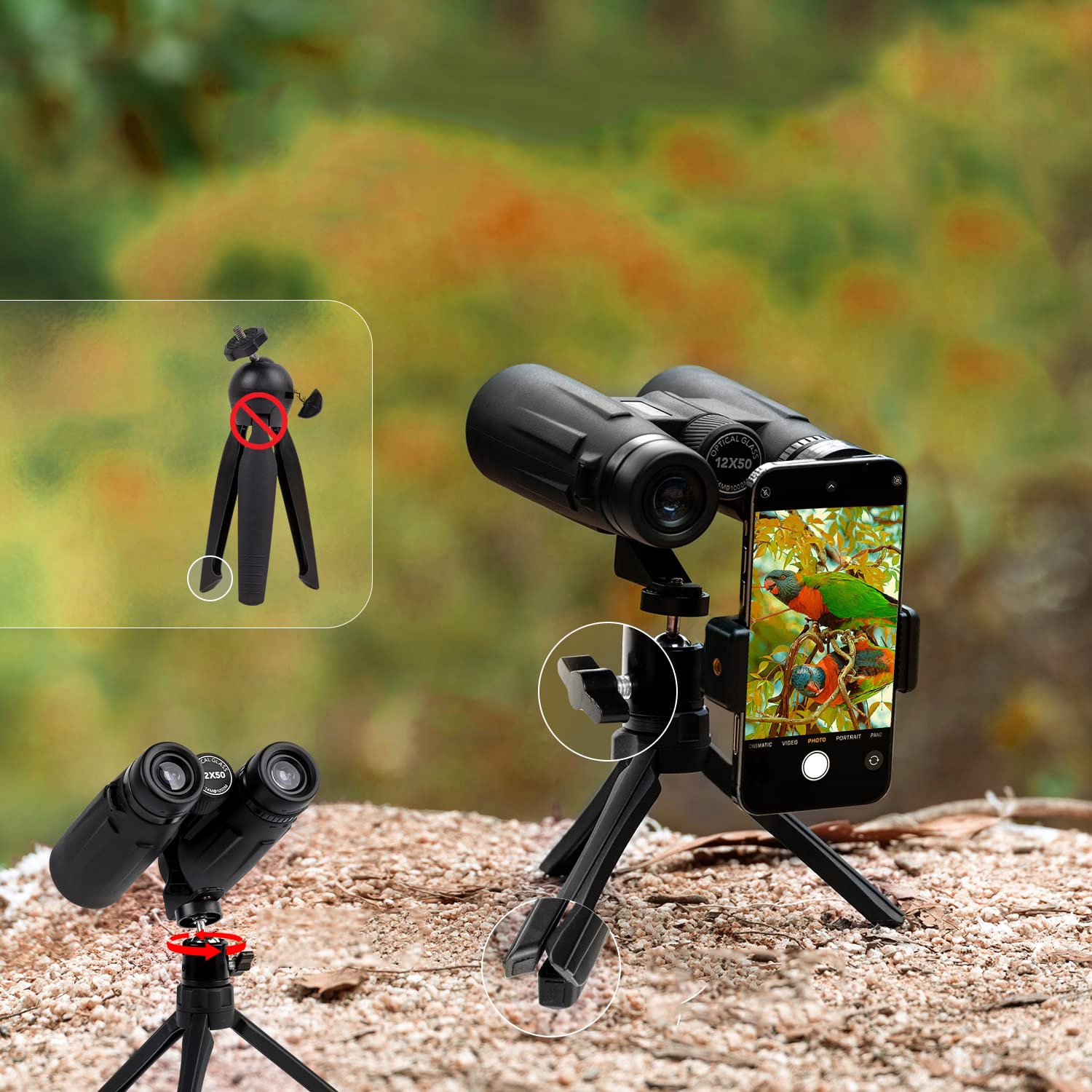 Бинокль для наблюдения за птицами поставляется с адаптером для телефона и металлическим настольным штативом, позволяющим стабилизировать телефон и делать более четкие и красивые фотографии.