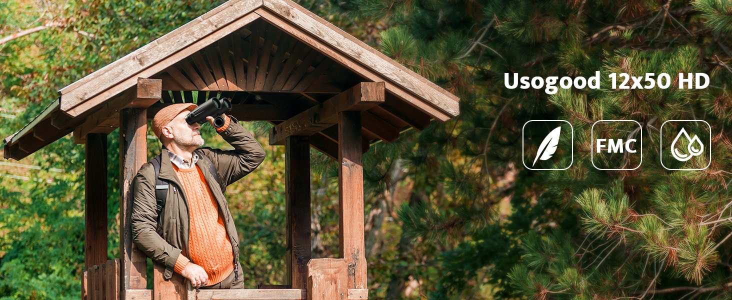 Бинокль Usogood 12x50 обеспечивает поле зрения 374 фута на 1000 ярдов, что шире, чем у биноклей 12x25, 10x25, 20x50.