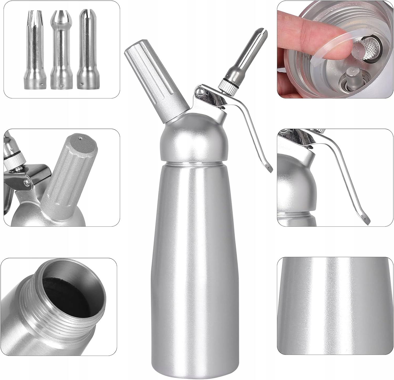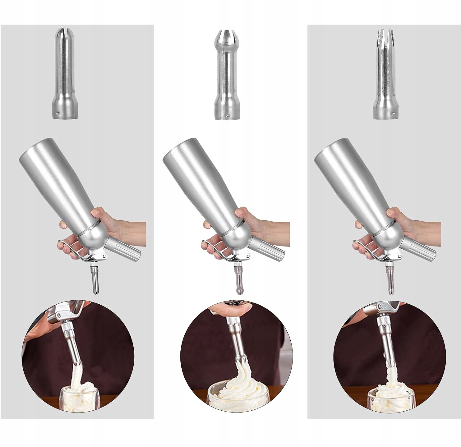 🍨🍨🍨 ПРОФЕССИОНАЛЬНЫЙ ДОЗАТОР ДЛЯ КРЕМА: Все металлические детали: алюминиевый корпус, головка, ручка зарядного устройства, колпачок и три декоративные насадки из нержавеющей стали. Крестообразные наконечники, цветы лотоса и сливы идеально подходят для украшения праздничных тортов, мороженого, печенье, молочные коктейли и горячие напитки со взбитыми сливками